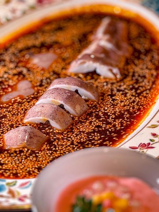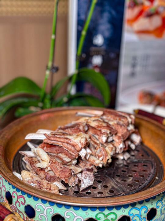 泉水煮锡林郭勒羔羊排肉质鲜嫩,没有一丝膻味,在清澈的泉水中炖煮,最大程度保留了羊肉的原汁原味,每一口都鲜嫩,搭配椒盐更有滋味。
