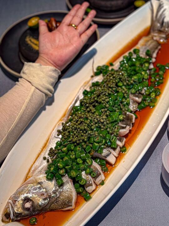 主菜青花椒蒸千岛湖大白鱼,足足3斤多的大白鱼,上面一层青花椒颜值超高。鱼肉肉质细嫩,入口即化,伴随着浓郁的青花椒香气,麻味恰到好处,将鱼的鲜美彻底激发出来。