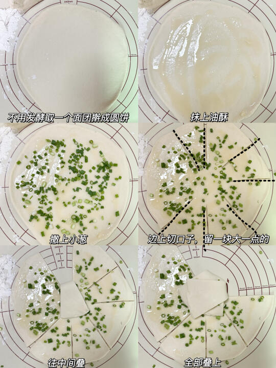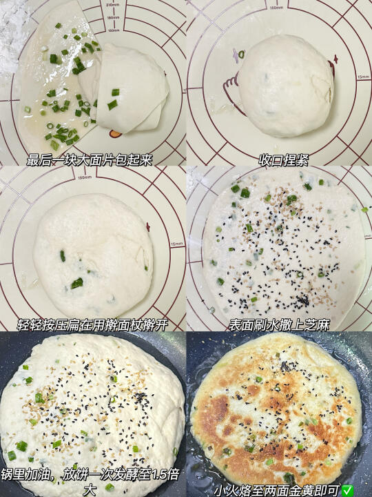 面粉300g+糖3g+酵母3g 加入水160g,搅拌成絮状 揉成光滑面团,分成2份,油酥:面粉+盐+油,不用发酵取一个面团擀成圆饼,抹上油酥,撒上小葱,边上切口子,留一块大一点的,面片往中间叠,全部叠上,最后一块大面片包起来,收口捏紧,轻轻按压扁在用擀面杖擀开,表面刷水撒上芝麻,锅里加油,放饼一次发酵至1.5倍大,小火烙至两面金黄即可✅