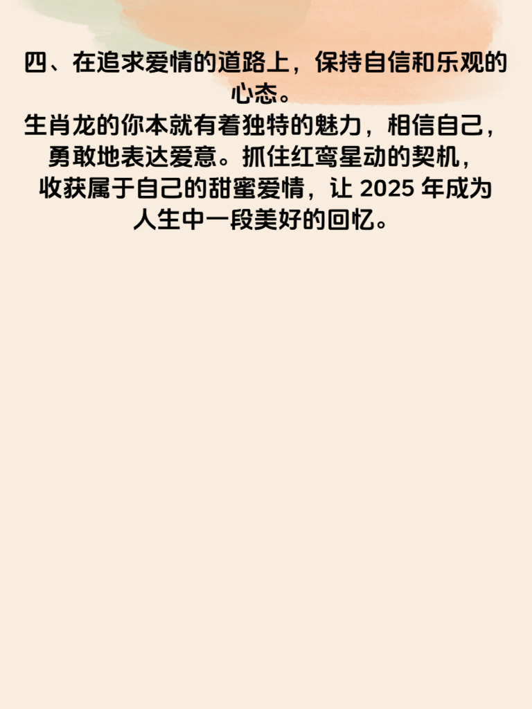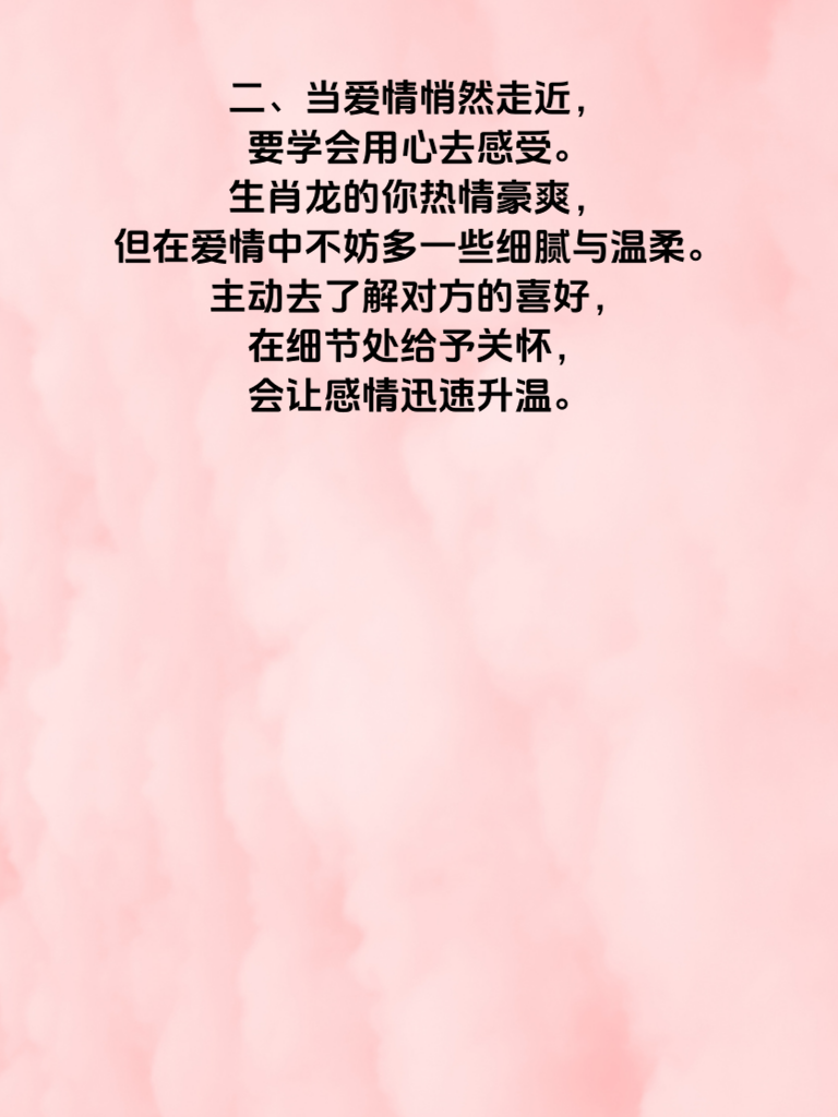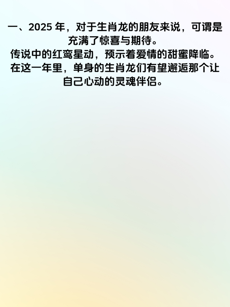 一、2025年,对于生肖龙的朋友来说,可谓是充满了惊喜与期待。传说中的红鸾星动,预示着爱情的甜蜜降临。在这一年里,单身的生肖龙们有望邂逅那个让自己心动的灵魂伴侣。 二、当爱情悄然走近,要学会用心去感受。生肖龙的你热情豪爽,但在爱情中不妨多一些细腻与温柔。主动去了解对方的喜好,在细节处给予关怀,会让感情迅速升温。 三、同时,金库悄然开启,也寓意着在感情中会有物质基础的稳固。但记住,金钱不是爱情的全部,真诚和付出才是赢得真心的关键。不要因为一时的物质收获而忽略了感情的经营。 四、在追求爱情的道路上,保持自信和乐观的心态。生肖龙的你本就有着独特的魅力,相信自己,勇敢地表达爱意。抓住红鸾星动的契机,收获属于自己的甜蜜爱情,让2025年成为人生中一段美好的回忆。