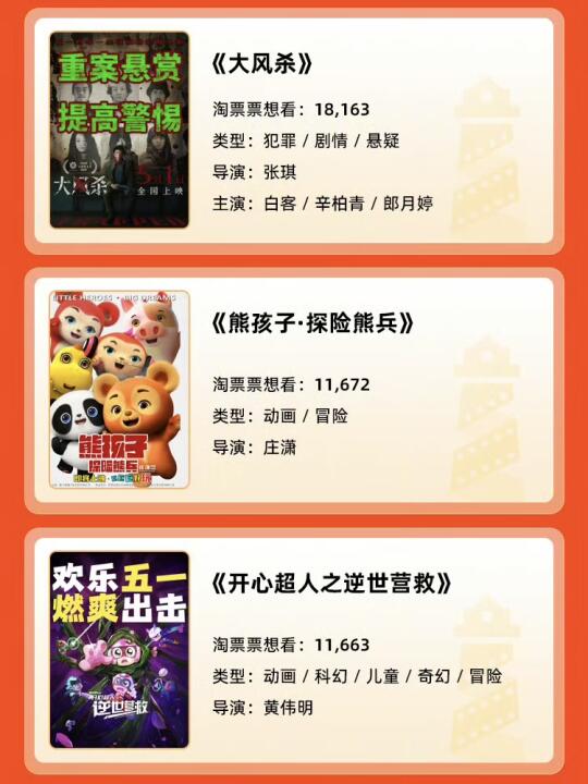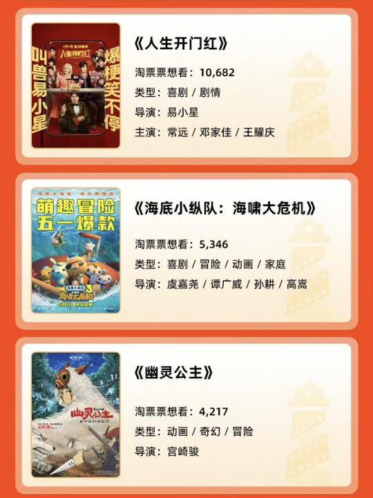今年五一档影片类型很丰富,13部影片各有不同: 经典重映《幽灵公主》宫崎骏 人物传记《水饺皇后》马丽 金融犯罪《猎金游戏》刘德华、欧豪 悬疑犯罪《大风杀》白客、辛柏青 公路喜剧《苍茫的天涯是我的爱》曾毅、周奇 动作冒险《雷霆特攻队》弗洛伦丝·皮尤 家庭剧情《独一无二》张婧仪、陈明昊 红运喜剧《人生开门红》常远、邓家佳 奇幻动画《开心超人之逆世营救》 萌趣动画《海底小纵队:海啸大危机》 冒险动画《熊孩子·探险雄兵》 犯罪惊悚《黑暗迷踪》柯伊善 热血漫改《九龙城寨之围城》古天乐、林峯
