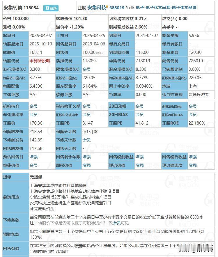 4月25日清源转债、安集转债上市,根据当前市场情绪及可转债交易行情: 清源转债上市时预计会有27%的溢价,预估上市价格为111元。清源转债为A+级转债,当前转股价值及纯债价值均较低,正股盈利能力尚可。清源转债股东配售率为65.85%, 流通市值为2.759亿左右,上市时可能会有一定的抛压。 安集转债上市时预计会有31%的溢价,预估上市价格为133元。安集转债为AA-级转债,当前转股价值较高,纯债价值一般,正股盈利能力较好可。安集转债股东配售率为61.64%, 流通市值为5.74亿左右,上市时可能会有一定的抛压。