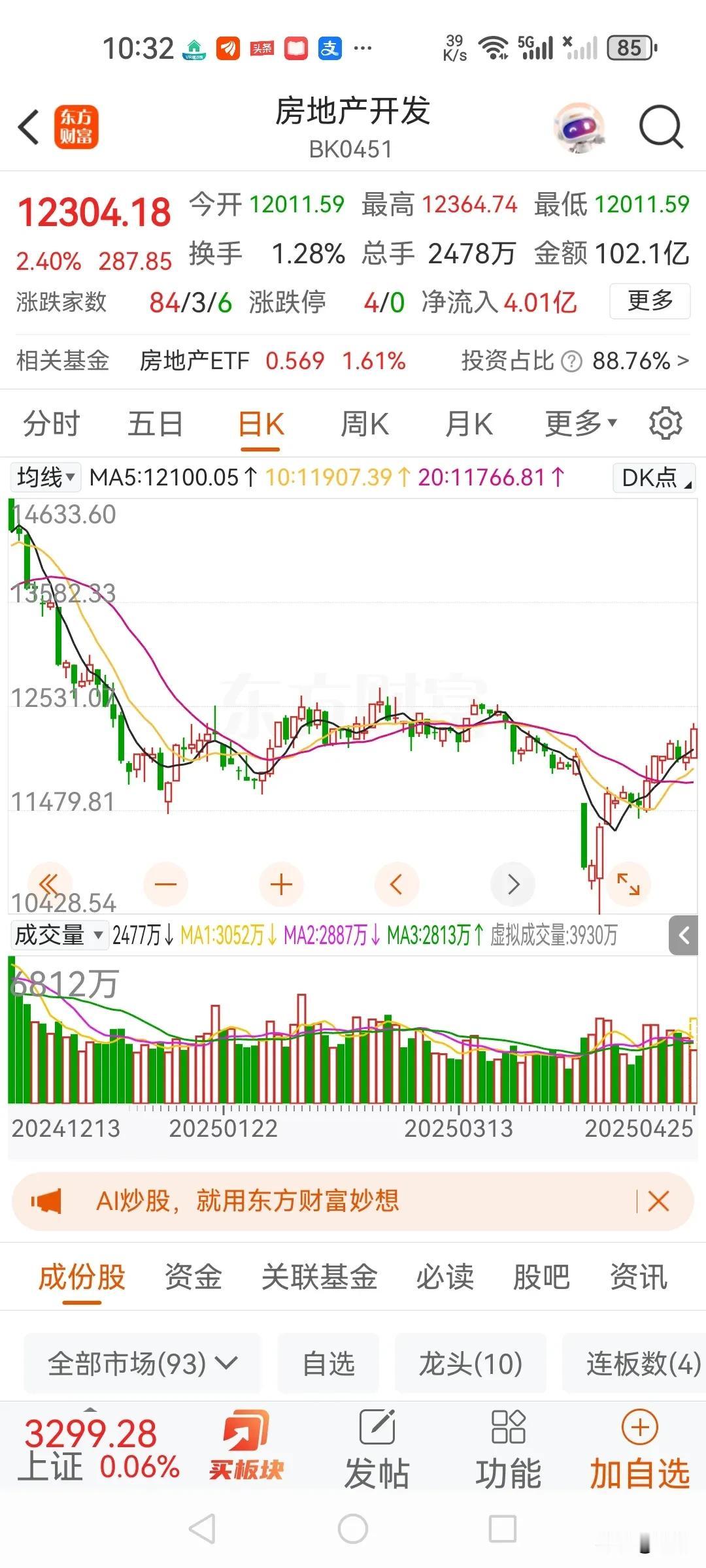 从上证指数和房地产板块的走势来看,房地产板块走势强于上证指数。 从房地产开发指数(BK0451)来看,今日涨幅达2.40% ,明显强于上证指数的0.10%涨幅。从日K线图上,均线系统呈现多头排列迹象(MA5、MA10、MA20 向上),且价格处于上行通道,显示出一定的上升动力。近期成交量也有所配合,资金净流入4.01亿,表明有资金在流入该板块,推动股价上升 总之,房地产板块近期表现强于上证指数。说明资本对这个板块比较看好。股市总是走在实体经济前面的。 再看上证指数:今日虽有上涨,但涨幅较小,且资金呈现净流出状态( - 10.02亿) 。日K线图上,均线系统中20日均线向下,显示大盘整体上仍面临一定压力,上涨动力相对不足。