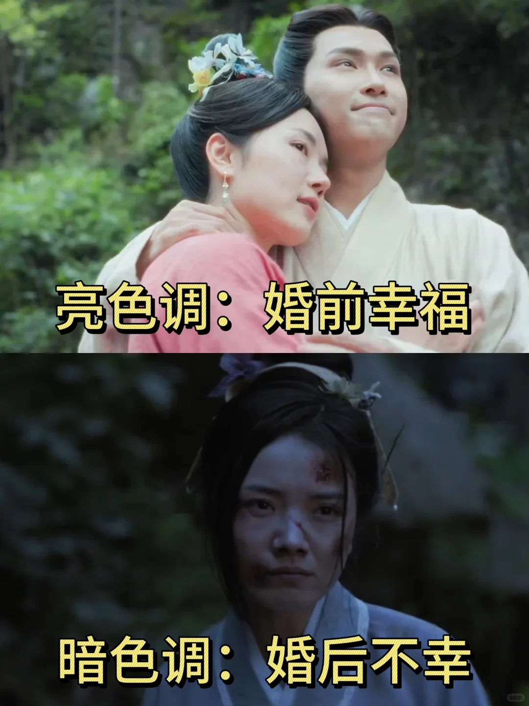 杨沅青在婚前幸福时刻用的就是亮色调,婚后被欺负整个人都处于阴暗环境。