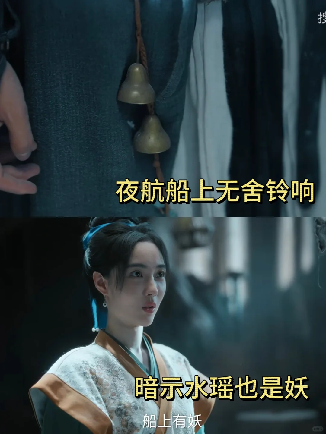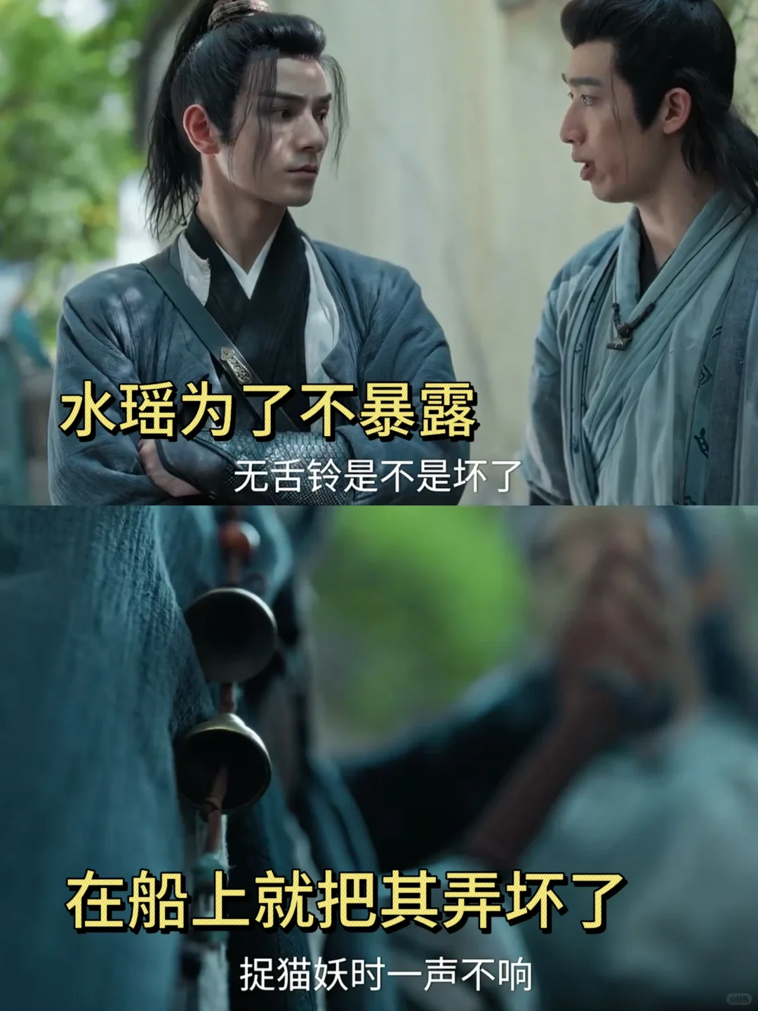 在夜航船中,吴进的无舌铃响动后和水瑶相遇,就埋下了水瑶是妖的伏笔。水瑶特地在打斗中把无舌铃弄坏,可以掩盖自己的身份,所以在抓猫妖时无舌铃没发挥作用。