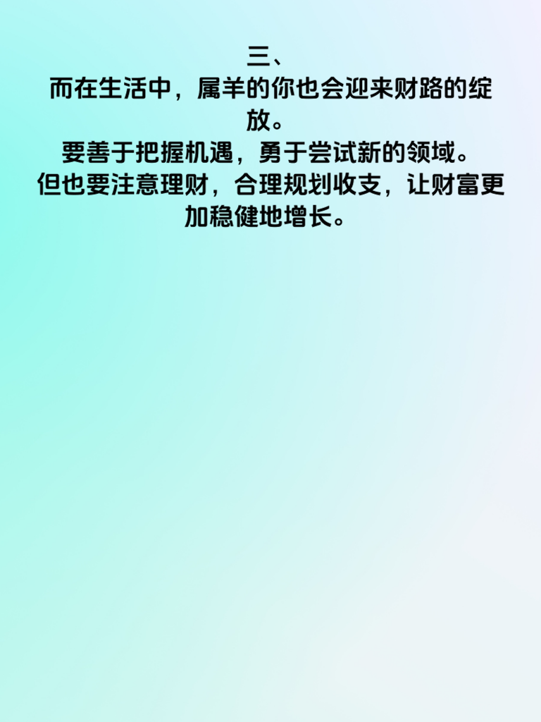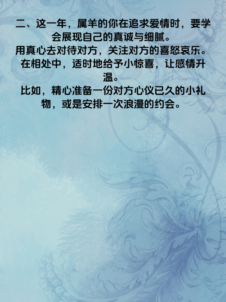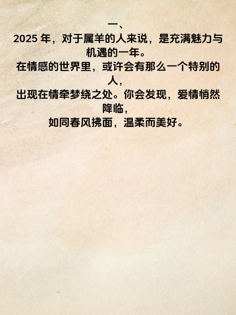 一、2025 年,对于属羊的人来说,是充满魅力与机遇的一年。在情感的世界里,或许会有那么一个特别的人,出现在情牵梦绕之处。你会发现,爱情悄然降临,如同春风拂面,温柔而美好。 二、这一年,属羊的你在追求爱情时,要学会展现自己的真诚与细腻。用真心去对待对方,关注对方的喜怒哀乐。在相处中,适时地给予小惊喜,让感情升温。比如,精心准备一份对方心仪已久的小礼物,或是安排一次浪漫的约会。 三、而在生活中,属羊的你也会迎来财路的绽放。要善于把握机遇,勇于尝试新的领域。但也要注意理财,合理规划收支,让财富更加稳健地增长。 四、在这一年里,还会邂逅许多小确幸。可能是清晨的一缕阳光,可能是朋友的一句问候。要学会珍惜这些瞬间,用心去感受生活的美好。因为,这些小确幸会汇聚成你幸福生活的拼图,让你的人生更加丰富多彩。