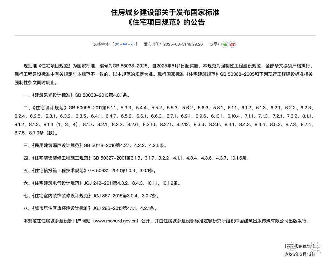 而这个问题,其实在2025年3月,国家住房和城乡建设部发布最新的《住宅项目规范》里面,就有专门提及,也让“好房子”的标准具象化了。