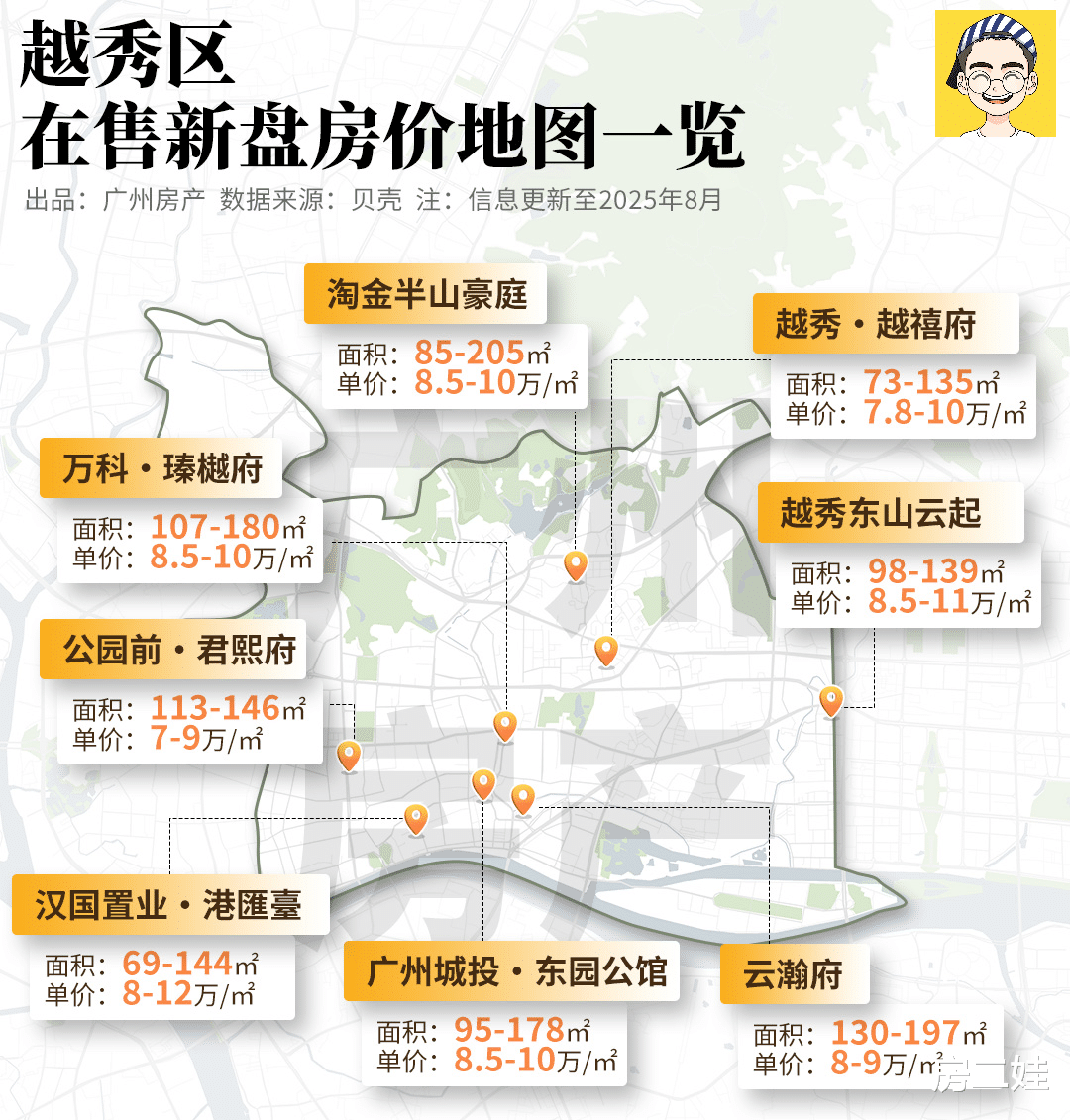 如图所示,现在越秀新房,基本都去到了8-10万/㎡,一套3房,基本800万起步,4房没有1000万基本不要想。