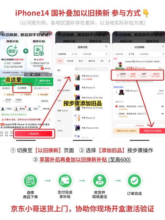 ❣️ 现在还有以旧换新活动,可以叠加国补,还有额外换新补贴,至高补600元❗️参照图5领取;京东小哥送货上门,协助你现场开盒激活验证