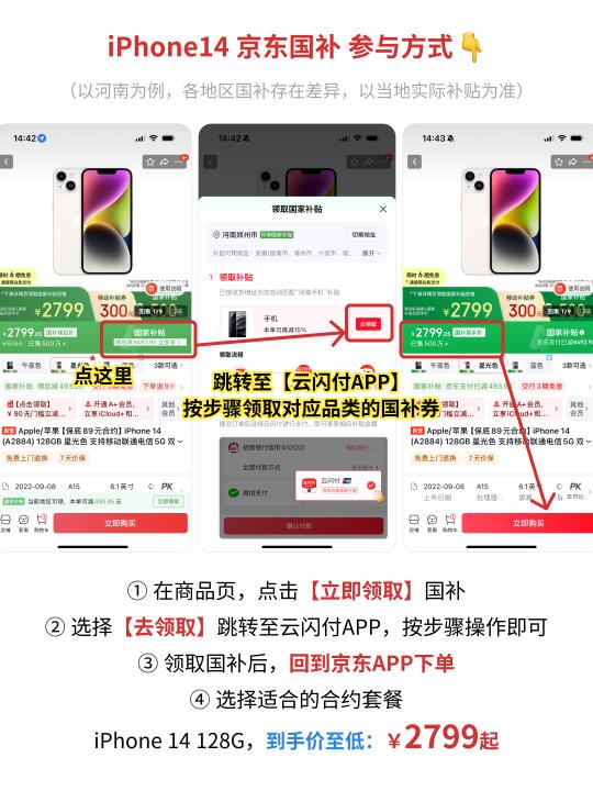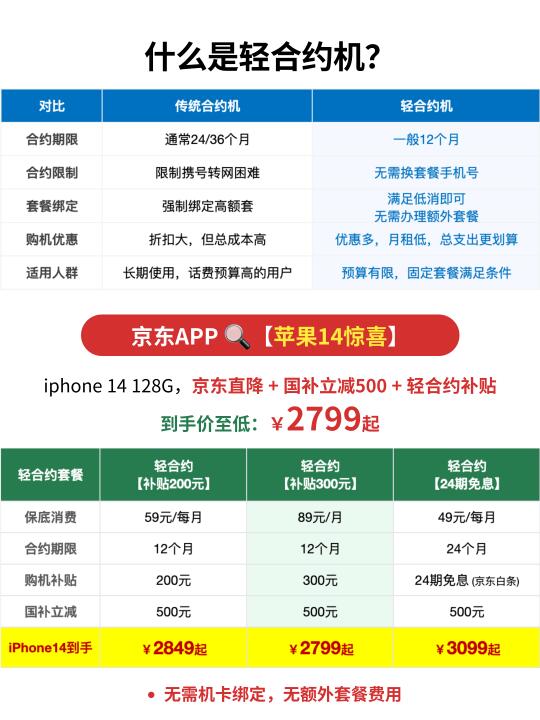 - iPhone14 128G,低消满足89元/月,轻合约补贴300元,国补立减500,到手2799起