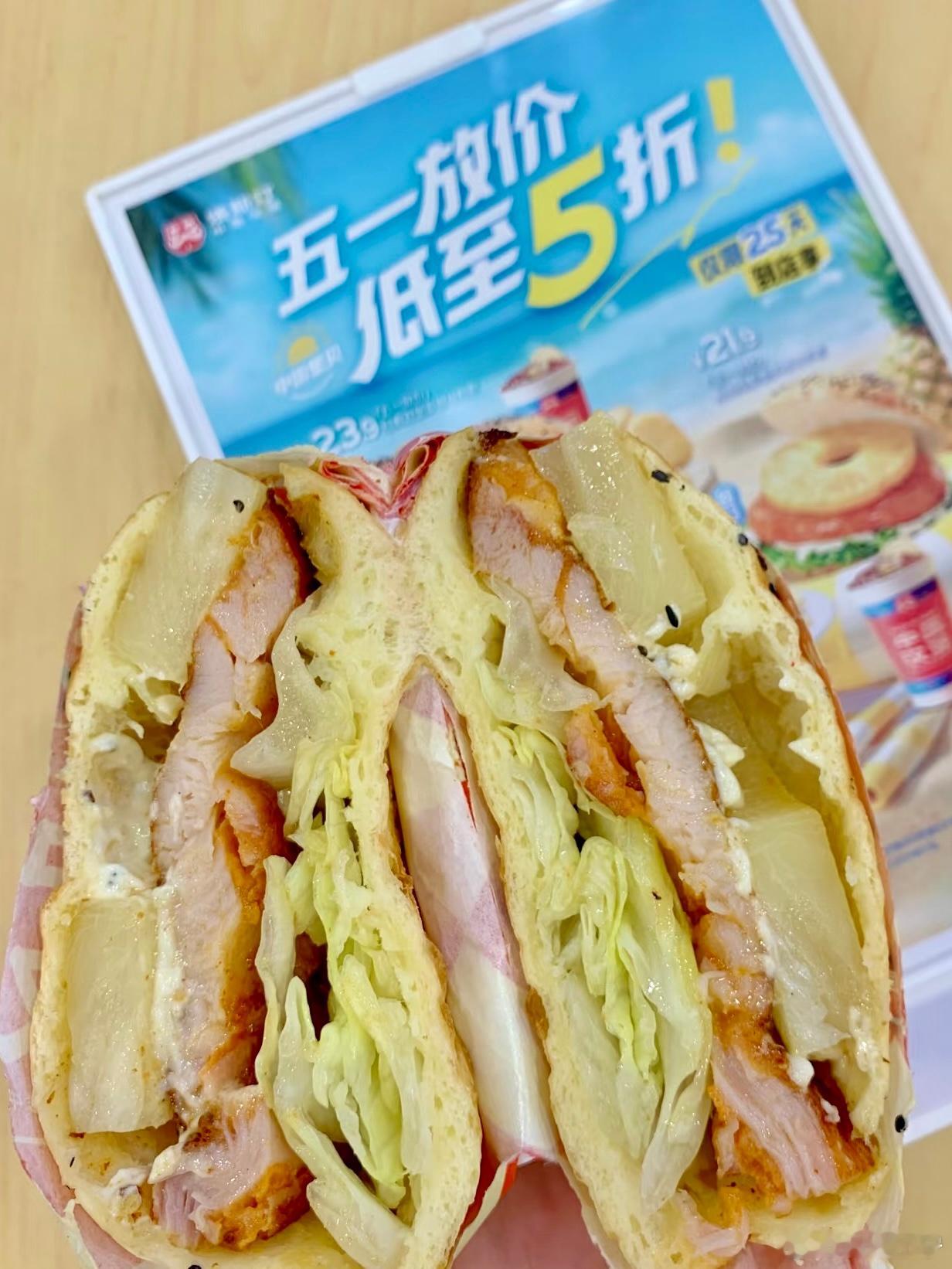 🍔整块板烧鸡腿肉,有炙烤的焦香,哈有板烧的厚重,又香又嫩会爆汁❗️❗️搭配上完整的厚切凤梨,一口下去,酸甜解腻,脆嫩的口感与香嫩的鸡腿一起在唇齿跳舞的感觉太美妙啦