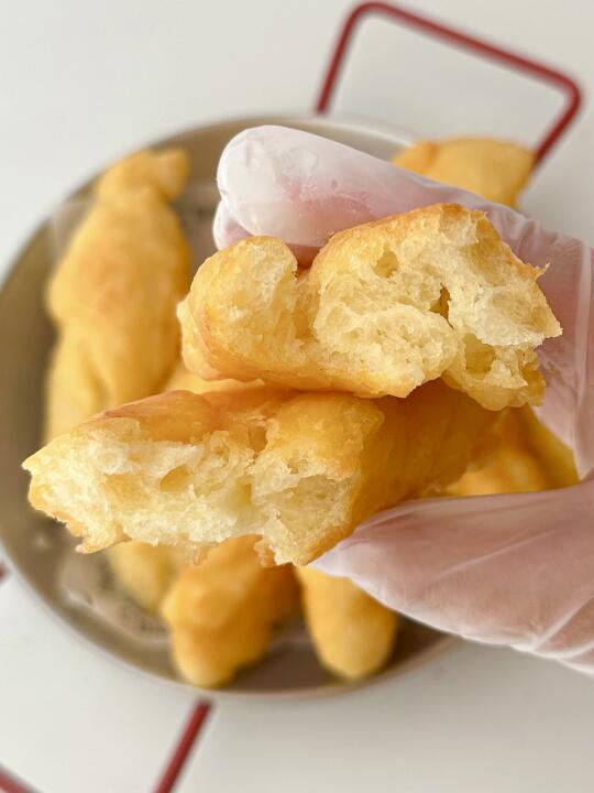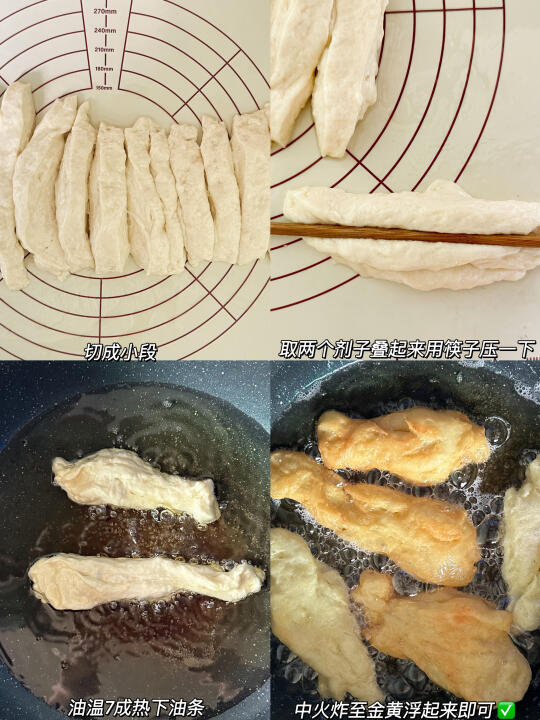 蓬松酥脆暴击,一口咬下去咔嚓声超治愈!早餐配豆浆太好吃啦!做法简单,自己做的太放心了! - 🛒食材: 面粉300g 酵母3g 玉米油20g 鸡蛋1个 盐2g 温水180g 👩🏻🍳做法: 面粉300g+酵母3g+玉米油20g+鸡蛋1个+盐2g 加温水180g,盖保鲜膜发酵至两倍大,面团表面抹油,切成差不多的条形剂子取两块剂子叠起来,中间用筷子压一下,油温7成热下油条 中火炸至金黄浮起来即可✅ -