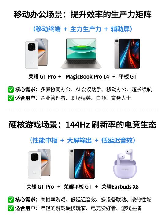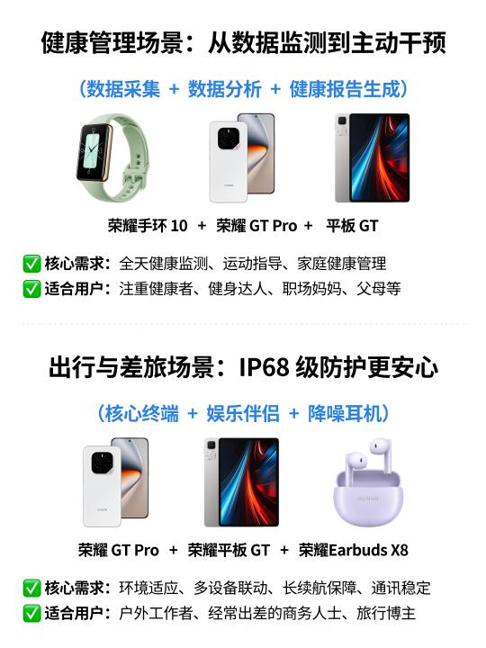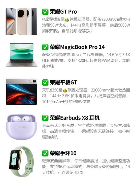 🌟 以荣耀 GT Pro为核心,联合荣耀MagicBook Pro 14(生产力终端)、荣耀平板 GT(娱乐与轻办公终端)、荣耀 Earbuds X8(音频交互终端)、荣耀手环 10(健康管理终端),覆盖办公、娱乐、健康、出行四大场景