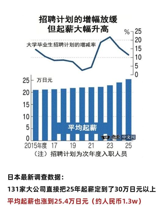 131家大公司直接把25年起薪定到了30万日元以上!平均起薪也涨到了25.4万日元(约人民币1.3w)