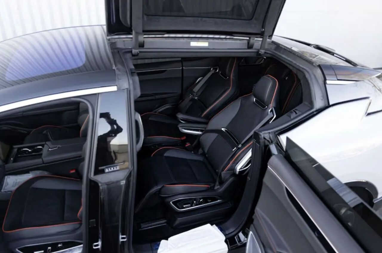 这台HiPhi X最颠覆认知的,当属它独一无二的车门设计,车辆不仅没有传统外露门把手,还将劳斯莱斯式对开门与鸥翼门完美融合,下半部分车门向后开启,上半部分车顶向上展开,这样的结构在全球量产车上都极为罕见,设计初衷是为了方便第三排乘客上下车,毕竟这是一台车长达到5.2米的六座豪华MPV,在满大街都是SUV的当下,这样的纯电MPV本就已是异类。