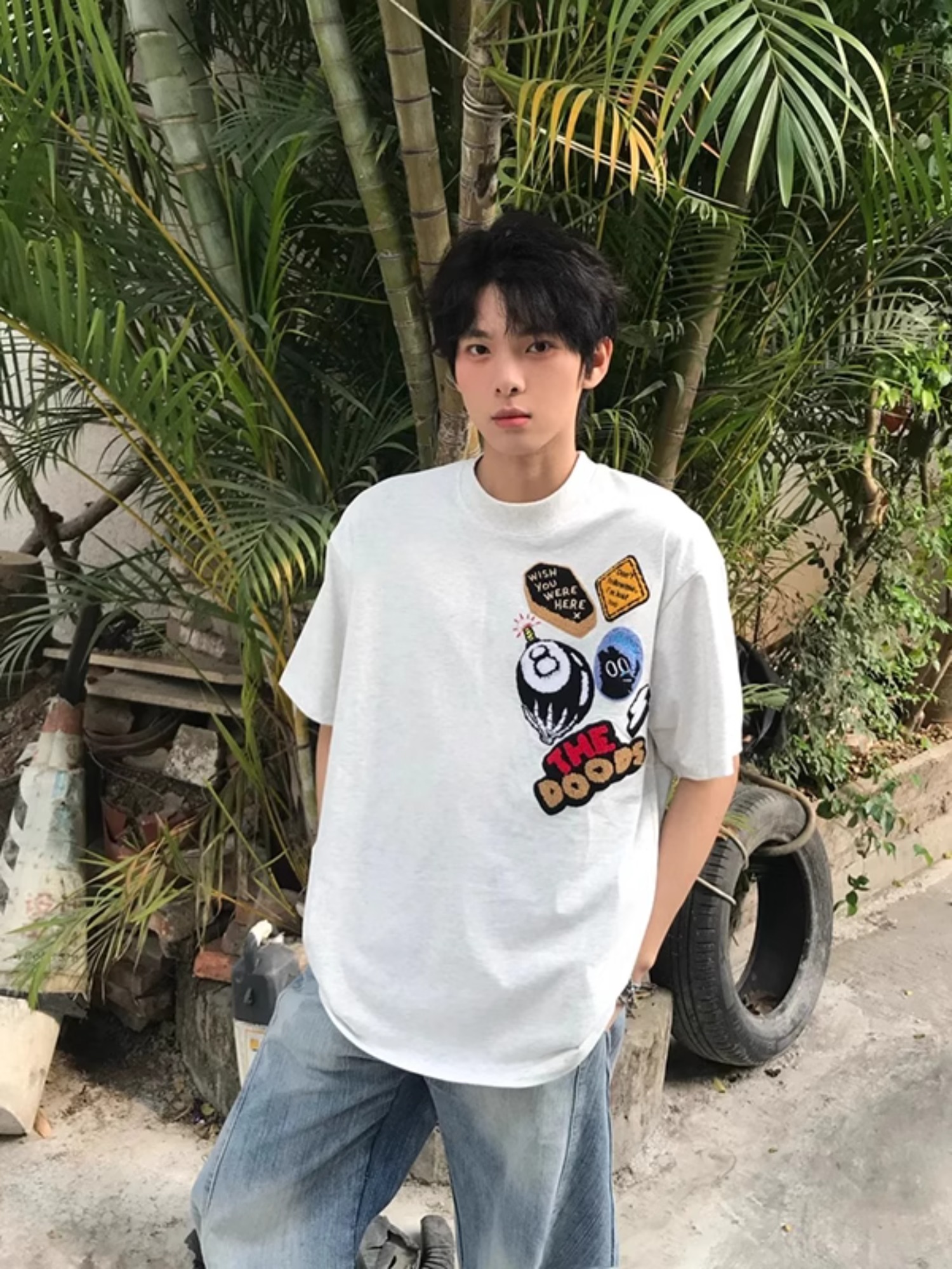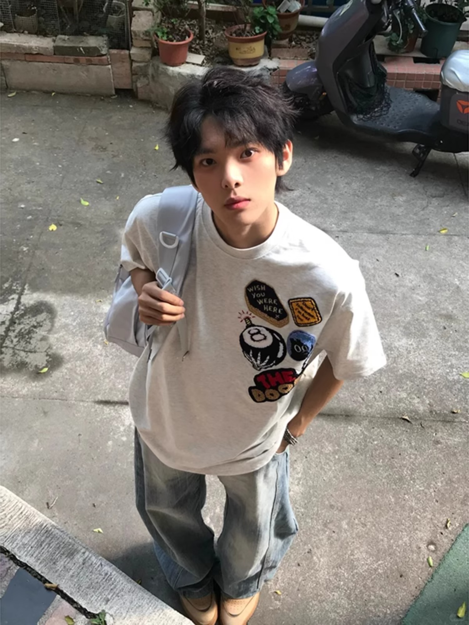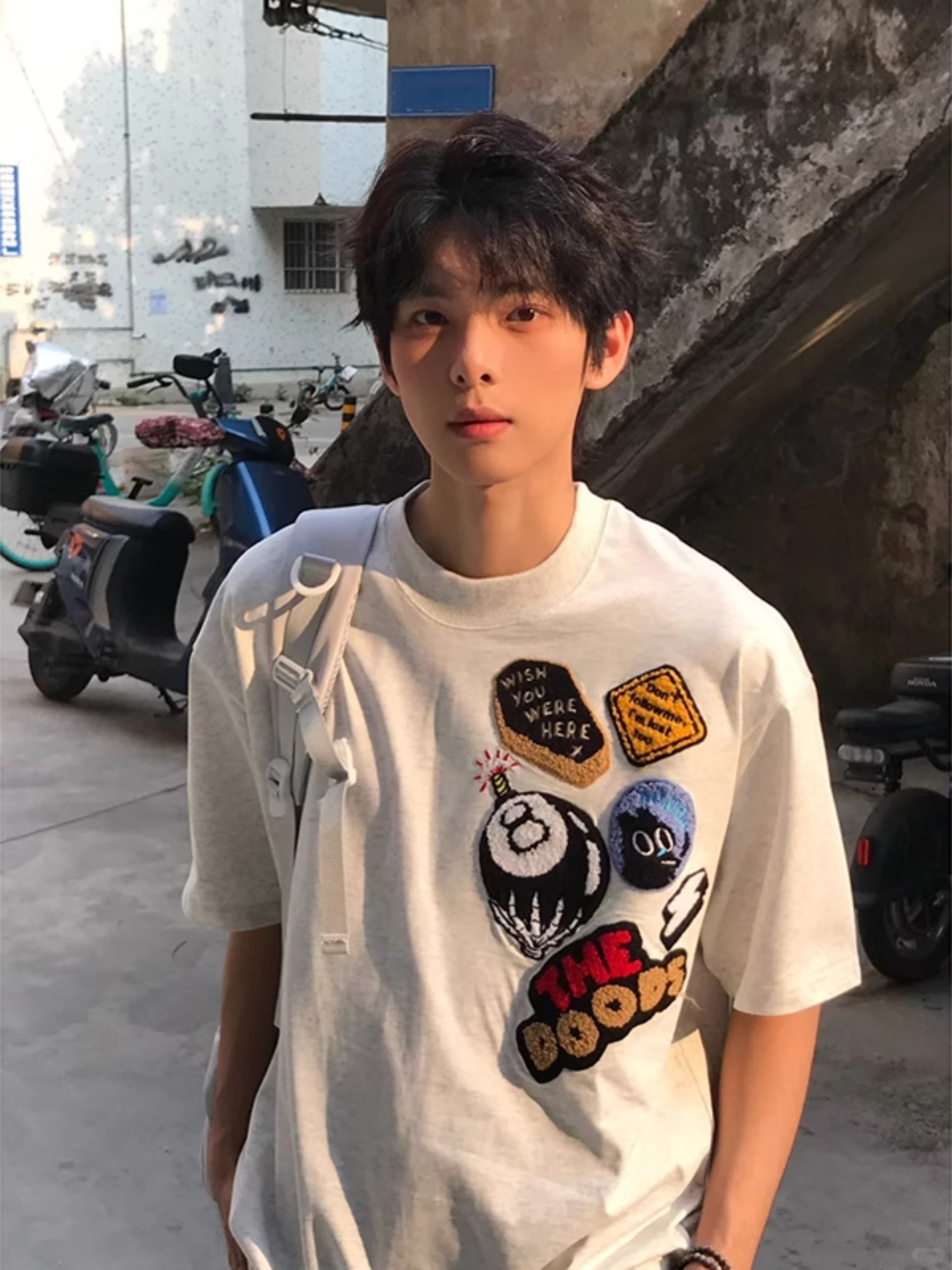 徽章刺绣美式灰色短袖男夏季少年感穿搭潮牌