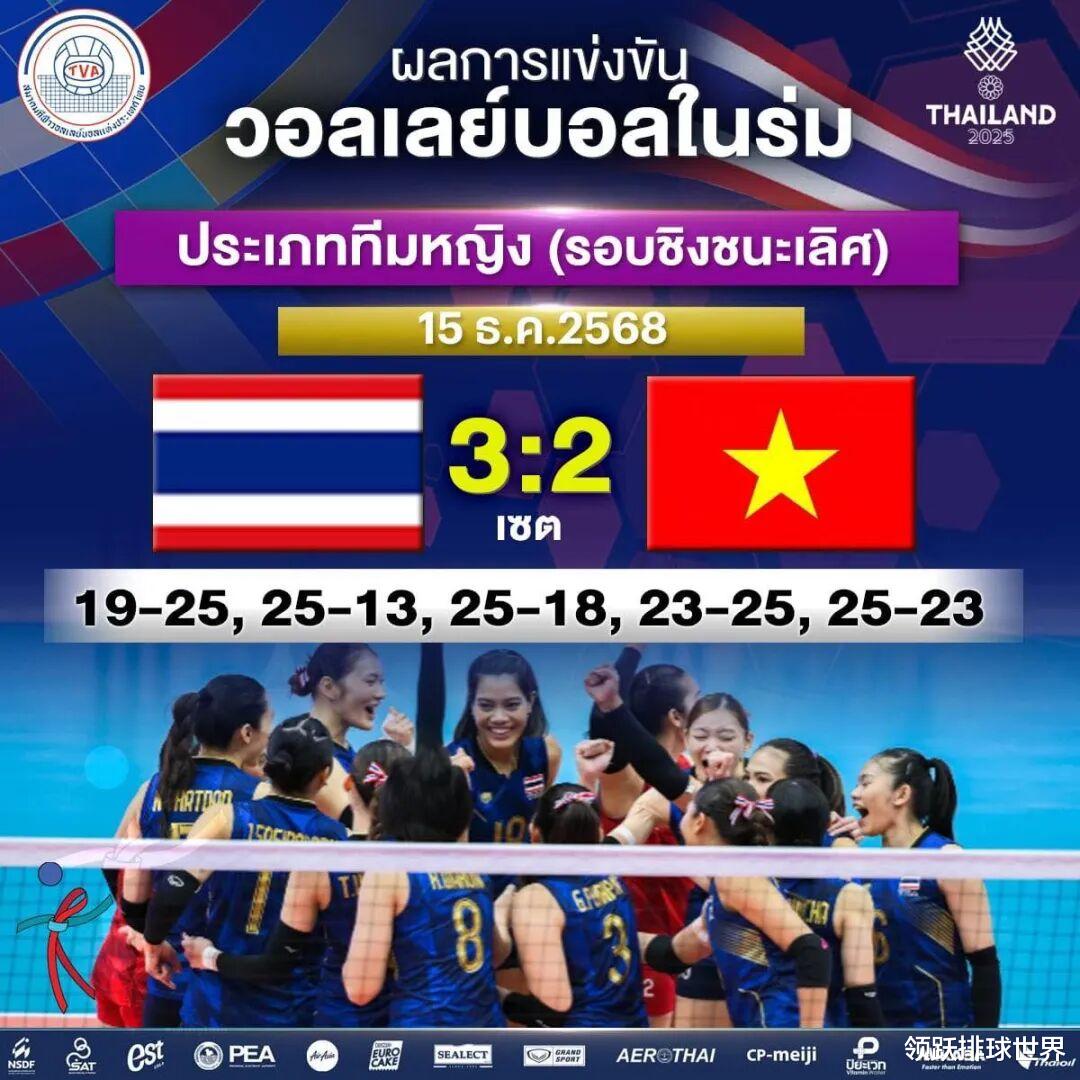 北京时间12月15日,第33届东南亚运动会女排项目在泰国曼谷华马克室内体育馆迎来压轴大戏,女排金牌争夺战。坐镇主场的泰国女排与老对手越南队再次狭路相逢,上演连续第四届东南亚运动会决赛对决,经历五局苦战,泰国女排最终以3比2(19-25,25-13,25-18,23-25,25-23)险胜对手,成功蝉联冠军,实现东南亚运动会十五连冠壮举,并将总冠军次数刷新至17次,巩固其“东南亚排球女王”的地位。