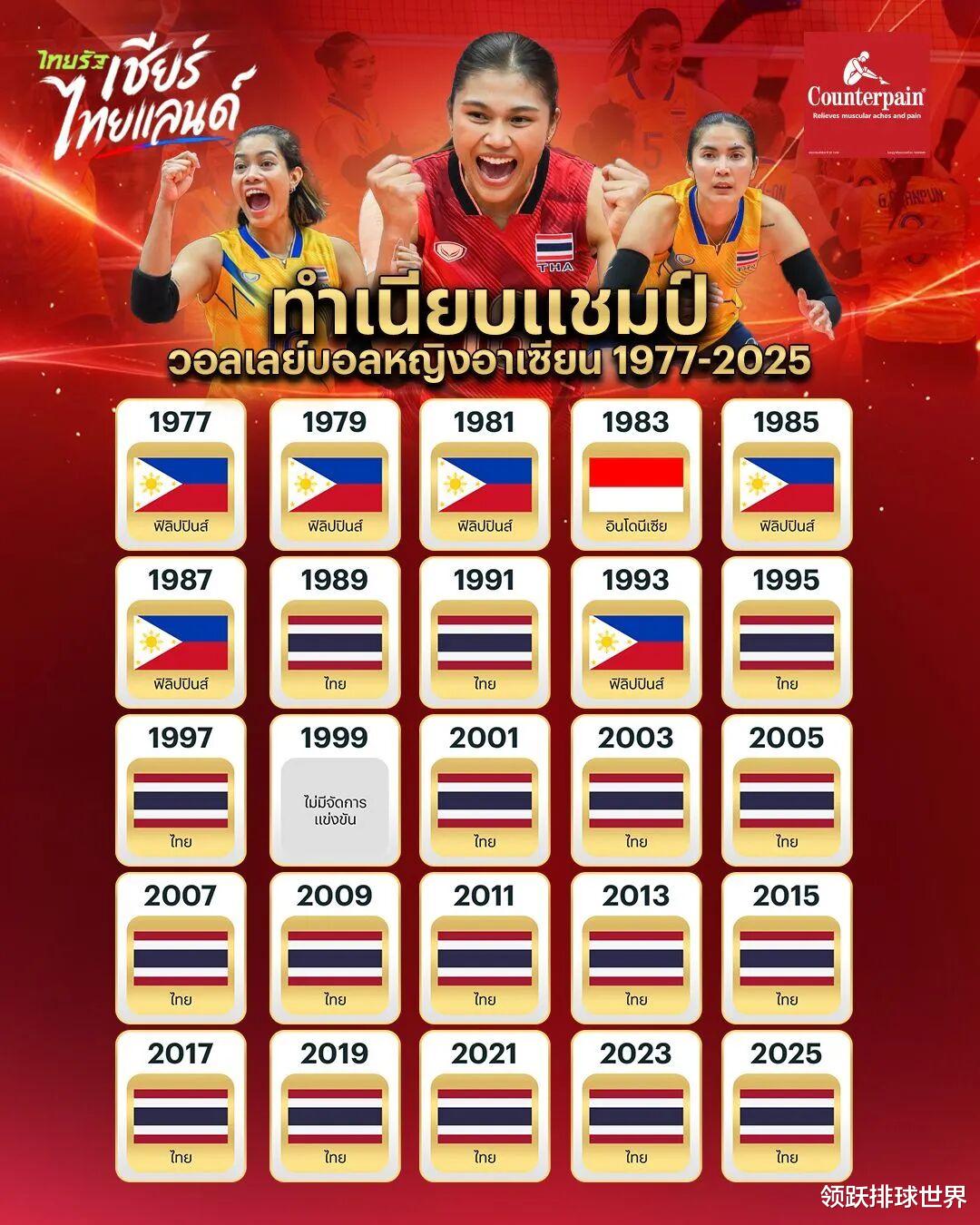 截至目前,整个东南亚排坛情况,泰国17金2银2铜(含15连冠1995–2025)、菲律宾6金2银4铜(早期霸主,1980年代前中期称雄)、印尼1金7银10铜,越南12银。