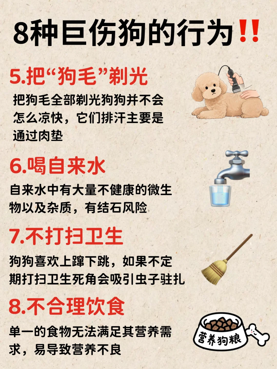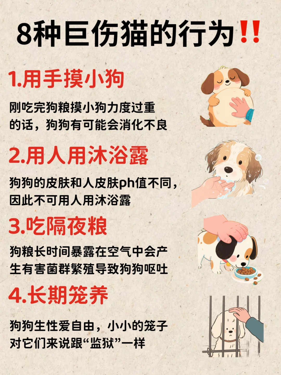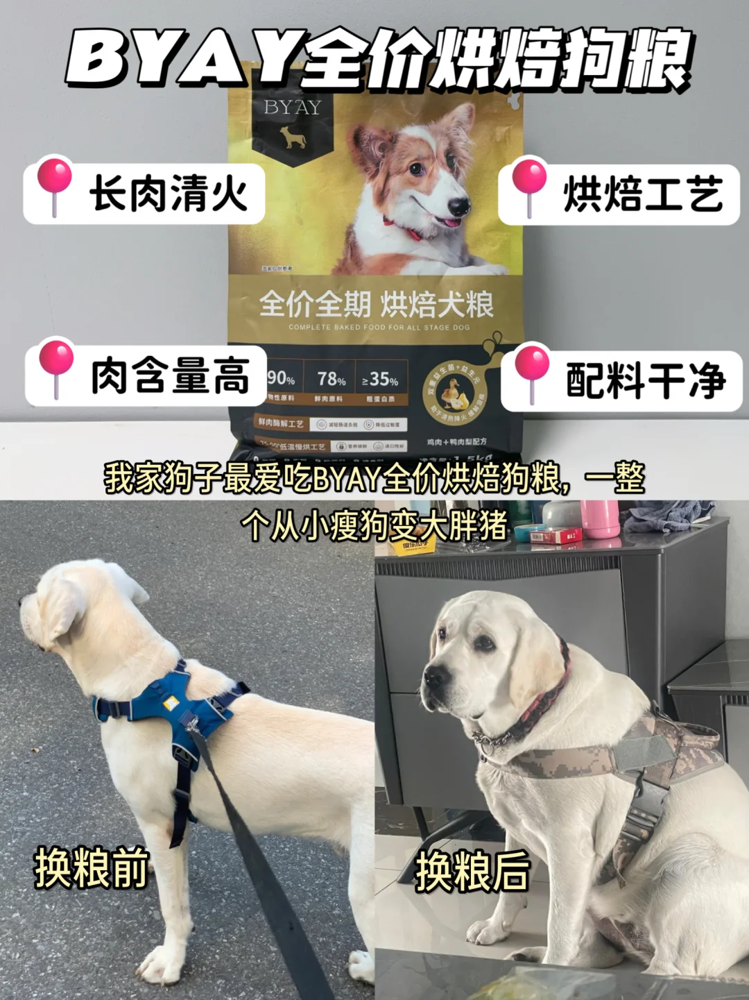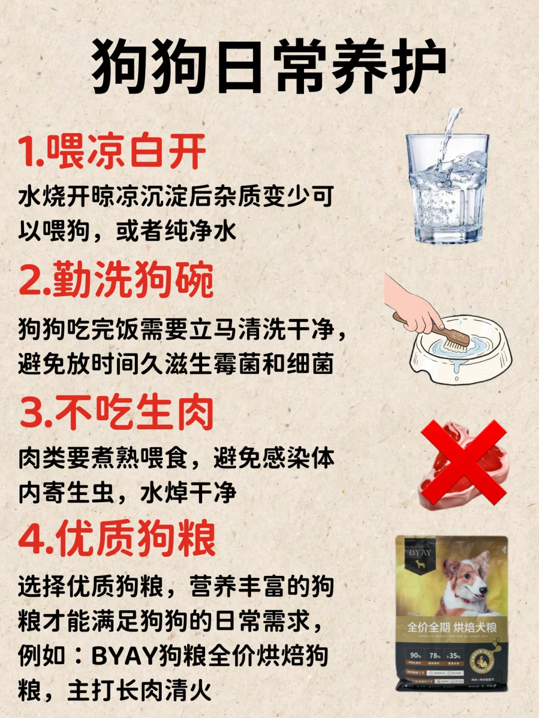 狗狗短命其实都是你的这些行为造成的,别再做伤害狗狗的事情了 看看下面的行为你占了几条! 1.用手摸小狗 2.用人用沐浴露 3.吃隔夜粮 4.长期笼养 5.把“狗毛”剃光 6.喝自来水 7.不打扫卫生 8.不合理饮食 有你目前正在做的吗❓ 你有真正了解狗狗的需求吗? 狗狗的口粮才是重中之重❗️一定要选择适合狗狗的狗粮,可以选择配料干净、鲜肉含量多的BYAY全价烘焙狗粮,之前我家狗子老是挑食不爱吃饭,朋友就强烈推荐我换BYAY全价烘焙狗粮,完全是瘦瘦小狗的天选狗粮!!