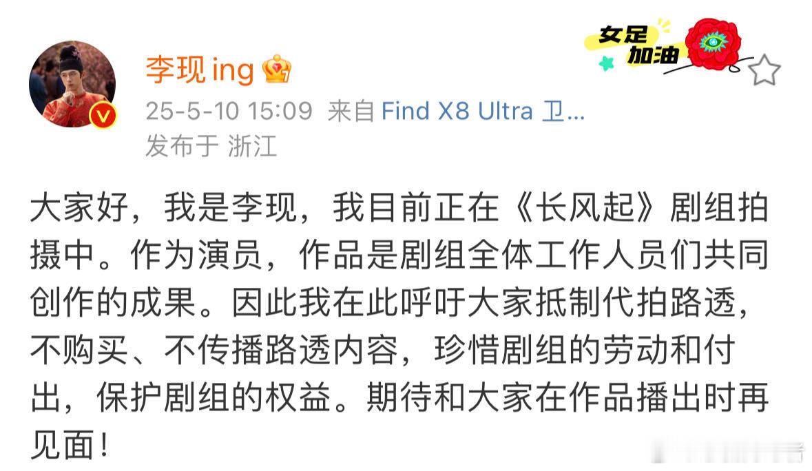 李现拍摄长风起呼吁抵制代拍 “呼吁大家抵制代拍路透,不购买、不传播路透内容”,和在作品播出时再见面吧![打call]