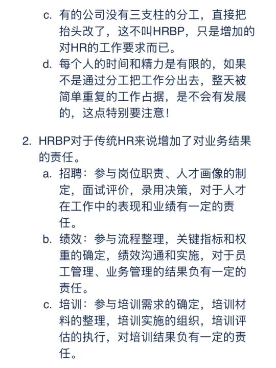 c. 有的公司没有三支柱的分工,直接把抬头改了,这不叫HRBP,只是增加的对HR的工作要求而已。
