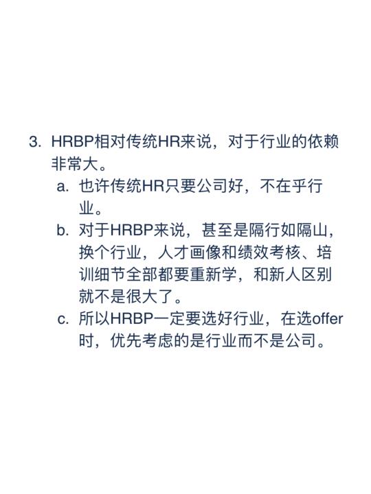 c. 所以HRBP一定要选好行业,在选offer时,优先考虑的是行业而不是公司。