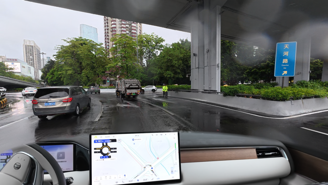 至于广州早高峰令老司机都要谨慎对待的两轮电动车,虽然在台风天数量有所减少,但依然是马路上最需要留神的X因素。不过这对于有29个感知单元的向往S9来说依然是小菜一碟,尤其是从视野盲区快速贴近的电动车,向往S9无一遗漏全部都能识别到,同时还会提前规划防御性驾驶路线,在车道内与电动车保持一定的安全距离,令人十分安心。