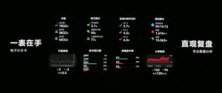 还有个专属高尔夫球场表盘,当打完球后会在表盘上显示您的高光时刻,当然,还有更丰富专业的复盘模式,以及明显教练课程。