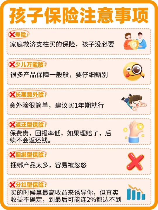 分红型、返还型、捆绑型保险,低收益教育金以及寿险,对宝宝而言并非合适之选,它们普遍存在收益低或价格高但实用性差的问题。为孩子配置保险,预算建议不超过家庭年收入的 2% ❗️❗️