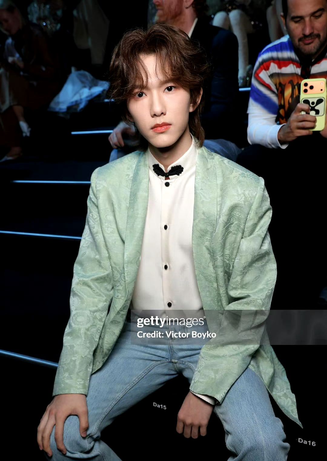 同一秀场的马伯全,全靠颜值撑住了这套造型,白色缎面衬衣搭配浅绿色印花西装外套,下半身是浅蓝色牛仔裤。