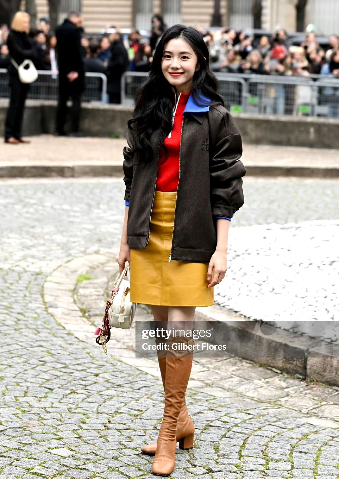 这次秀场上的刘浩存玩起了色块混搭,棕色皮衣搭配蓝红撞色衬衣,下半身穿了一条黄色皮质包臀裙,脚踩棕色皮靴。