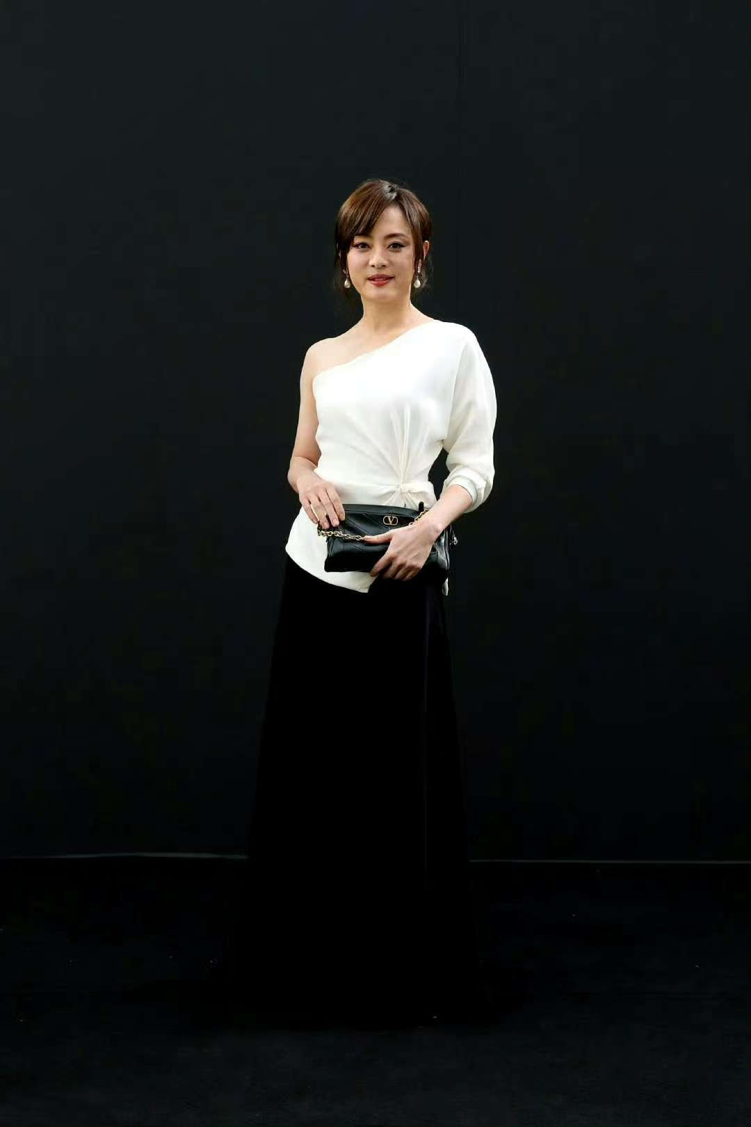 此次亮相选择了一套白色斜肩礼服搭配黑色半裙,高级感满满的材质,让简单的款式也显得十分贵气。
