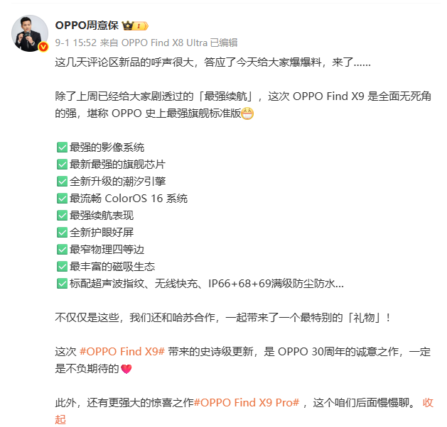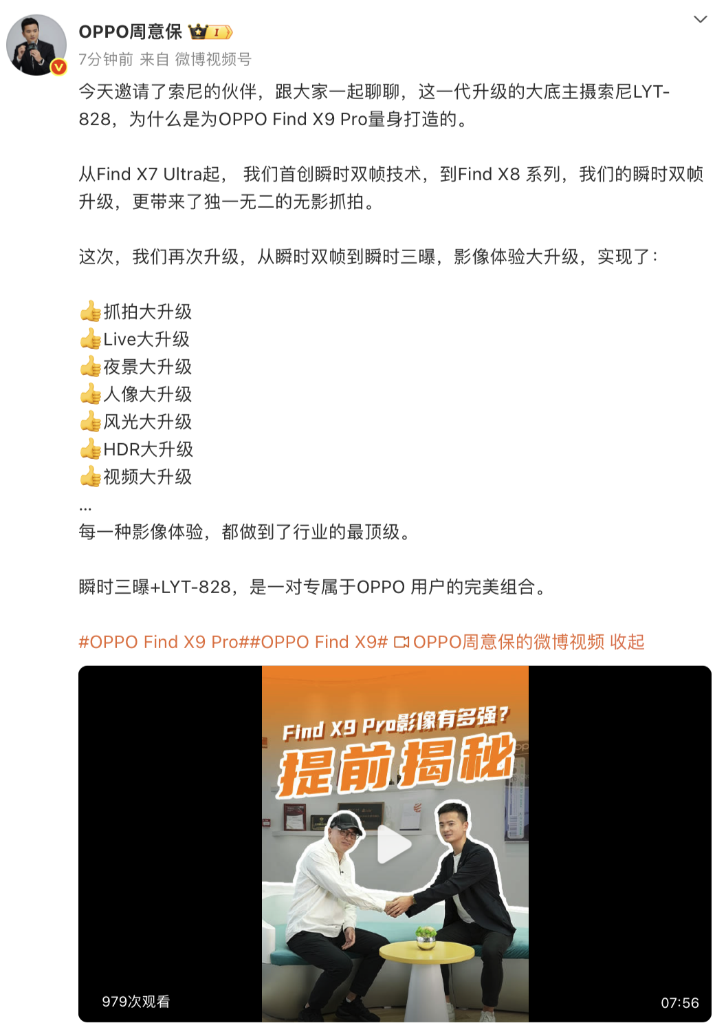 巧合的是,近日在外网亮相令一众果粉兴奋的哈苏影像套件,猜测大概率就是OPPO家的,从周意保的微博转发就能看出这点,毕竟是与哈苏合作的手机品牌只有OPPO。所以OPPO+索尼+哈苏的Find X9 Pro拍照表现到底能强悍到什么地步,还真是令人期待。