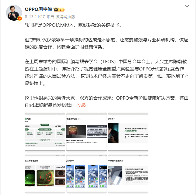 而在护眼方面,周意保在8月份也曾表示:“OPPO全新护眼健康解决方案,将由Find旗舰新品首发搭载!”预计可以Find X9系列上看到。据爆料称OPPO投入了超10亿元研发资金,引入了医学临床指标来定义屏幕健康标准,实打实的做护眼。