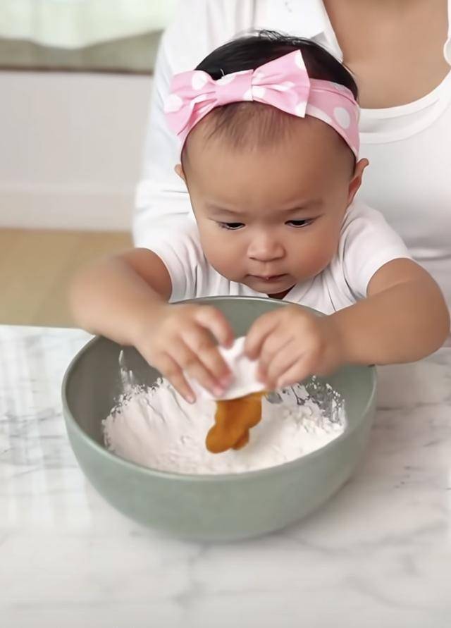 而且小家伙的肤色偏暗,看起来十分健康,在妈妈朱慧敏的引导下,小家伙拿起手中的勺子在搅拌碗里的面粉,显然她自己都不知道究竟在做些什么,而在朱慧敏一步步的指引下,小家伙还放入了不少材料,看起来有些专业。