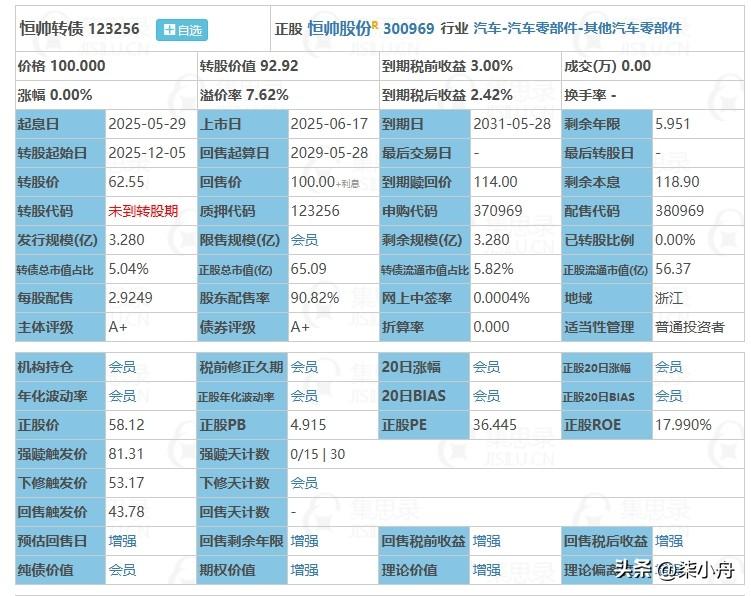 6月17日恒帅转债上市。根据当前市场情绪及可转债交易行情,恒帅转债上市时预计会有33%的溢价,预估上市价格为124元。 恒帅转债为A+级转债,当前转股价值较低,纯债价值较低,正股盈利能力尚可,且上市首日流通市值为0.937亿,被炒作的可能性较大。