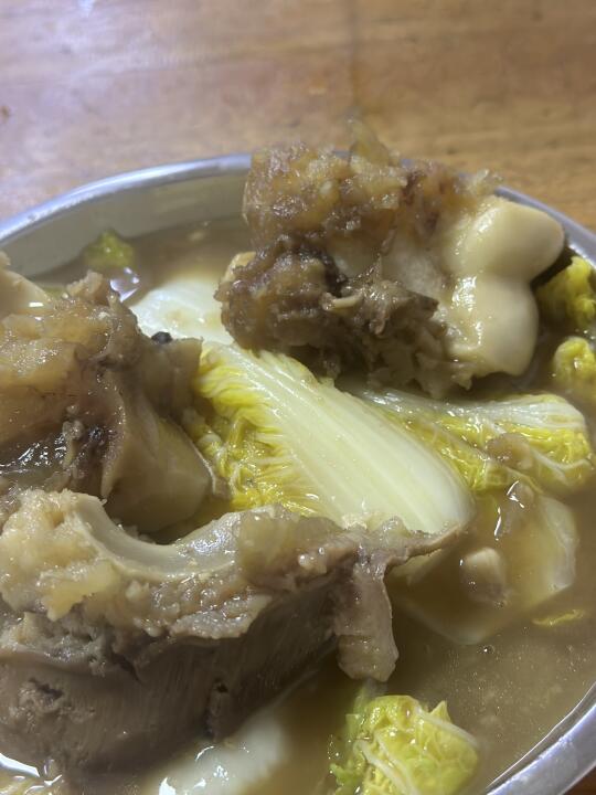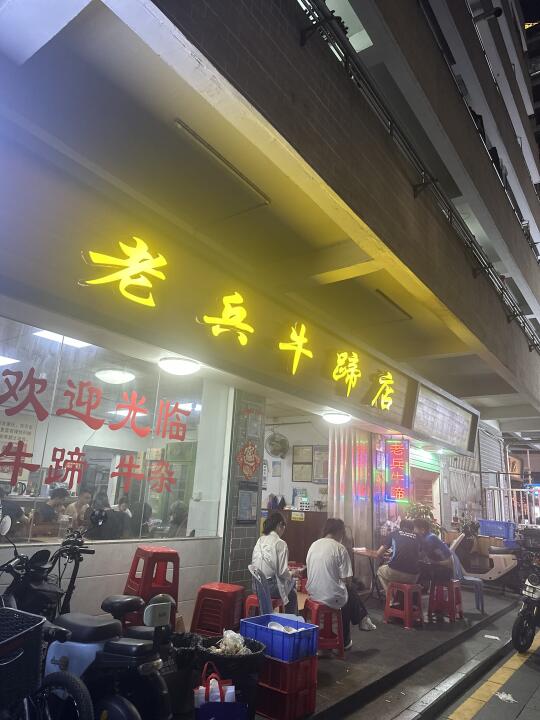 大声安利本地美食 附近都是吃的,而且好像很多都比较地道,选了一圈,选定这个老兵牛蹄,主要是没有专门吃过牛蹄,16块一份的牛蹄,分成三块,另外点了娃娃菜一起煮出来,加上餐具费用,总共26块,因为荔枝吃多了,本来要加的面没有加,那个汤确实适合加份面的,下次需要点两份牛蹄,就点他们招牌牛蹄就好,原味不辣的应该更好吃一些,人多就加些娃娃菜百叶豆腐一起,这家店人气还是不错,还可以点牛杂,人来人往,基本都是满的,