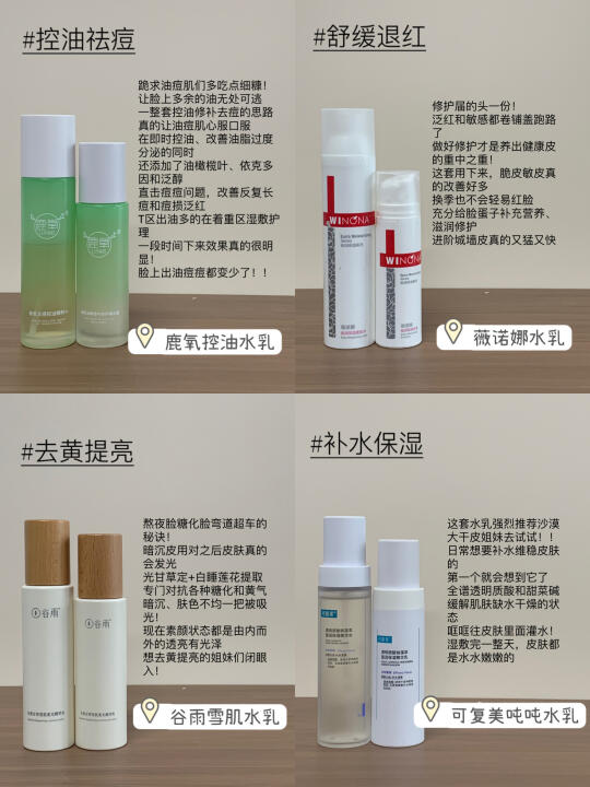 奉劝大家千万不要在买水乳的时候盲目跟风,十有八九都会踩雷!!!给大家整理了一些我自用的水乳,适合各种不同肤质,有需要的赶紧码住! - 🟡鹿氧控油水乳(控油祛痘) 跪求油痘肌们多吃点细糠!让脸上多余的油无处可逃,一整套控油修补去痘的思路真的让油痘肌心服口服,在即时控油、改善油脂过度分泌的同时,还添加了油橄榄叶、依克多因和泛醇,直击痘痘问题,改善反复长痘和痘损泛红,T区出油多的在着重区湿敷护理,一段时间下来效果真的很明显!脸上出油痘痘都变少了!! - 🟡薇诺娜水乳(舒缓褪红) 修护届的头一份!泛红和敏感都卷铺盖跑路了,做好修护才是养出健康皮的重中之重!这套用下来,脆皮敏皮真的改善好多,换季也不会轻易红脸,充分给脸蛋子补充营养、滋润修护,进阶城墙皮真的又猛又快 - 🟡谷雨雪肌水乳(去黄提亮) 熬夜脸糖化脸弯道超车的秘诀!暗沉皮用对之后皮肤真的会发光,光甘草定+白睡莲花提取,专门对抗各种糖化和黄气,暗沉、肤色不均一把被吸光!现在素颜状态都是由内而外的透亮有光泽,想去黄提亮的姐妹们闭眼入! - 🟡可复美吨吨水乳(补水保湿) 这套水乳强烈推荐沙漠大干皮姐妹去试试!!日常想要补水维稳皮肤的,第一个就会想到它了,全谱透明质酸和甜菜碱缓解肌肤缺水干燥的状态,哐哐往皮肤里面灌水!湿敷完一整天,皮肤都是水水嫩嫩的