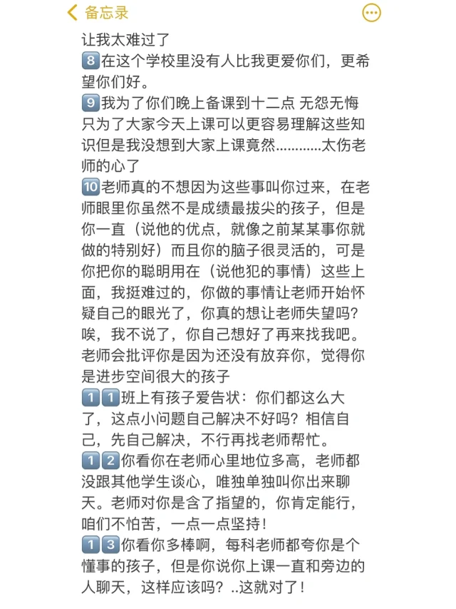👩🏫叮叮:在老师眼里,你一直是个特别机灵又善良的孩子,(说他的优点)每次你犯错都很耐心的教育你,而且你向我承诺不会再犯,可是为什么上课还是不认真,而且小动作那么多。我能单独找你谈话,是因为我还没有放弃你,觉得你一定会让老师刮目相看的。你现在说一说上课为什么…(说他惹的祸)