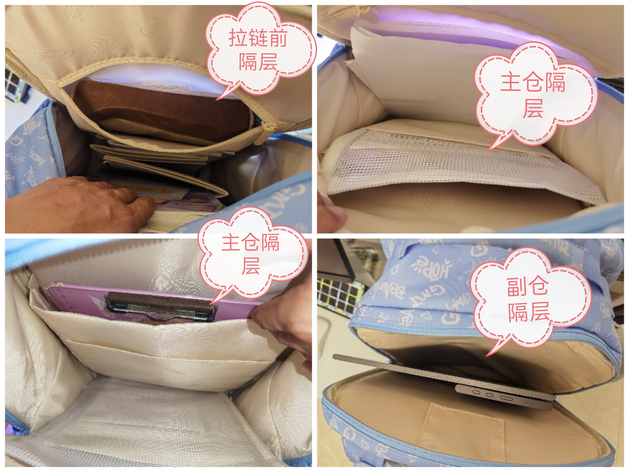 初中阶段由于学科的增加,书本要比小学阶段增加不少,多隔舱分类整理,很有必要。最前端和两侧的小袋子我就不展示了,书本主要靠大容量的主仓和副仓来盛装。如上图,我这一款是32升大容量书包,副仓隔层放的是15.4便捷屏,本来挺大的一个屏幕,放到里面都显得很小巧ಠ_ಠ;主仓隔层里面放的是A 4大夹板,放的也是轻轻松松;主仓前端的拉链小包,一个超大的笔袋轻轻松松就可以放下。可以说这个容量的书包,无论是主课、副课还是考试材料,一个背包轻轻松松全部可以放得下。