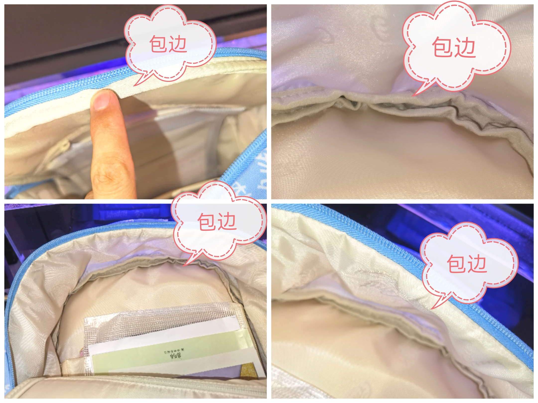 以现在的布料纺织技术,布匹的强度已经足够,尤其是采用新型材料,耐用性本身没有什么问题。但是,作为承重量比较大的背包,往往是布匹缝合接口容易出问题。这款背包我仔细查了一下,所有的缝合面,都进行了锁边包边。如上图,除了外面显而易见的位置,就算是里面不起眼的地方,也进行了包边处理,从走的针脚也能看出来,均进行了加强处理,耐用性直线上升。我家女儿现在是初二,我觉得上了高中还能接着用(#^.^#)。