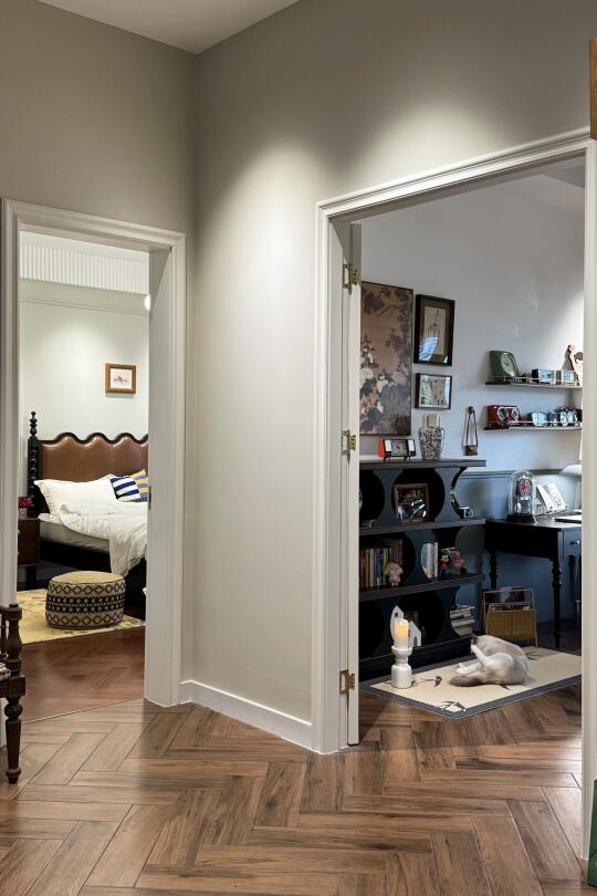 推开双开门 是复古绿色的半墙➕棕色木纹砖