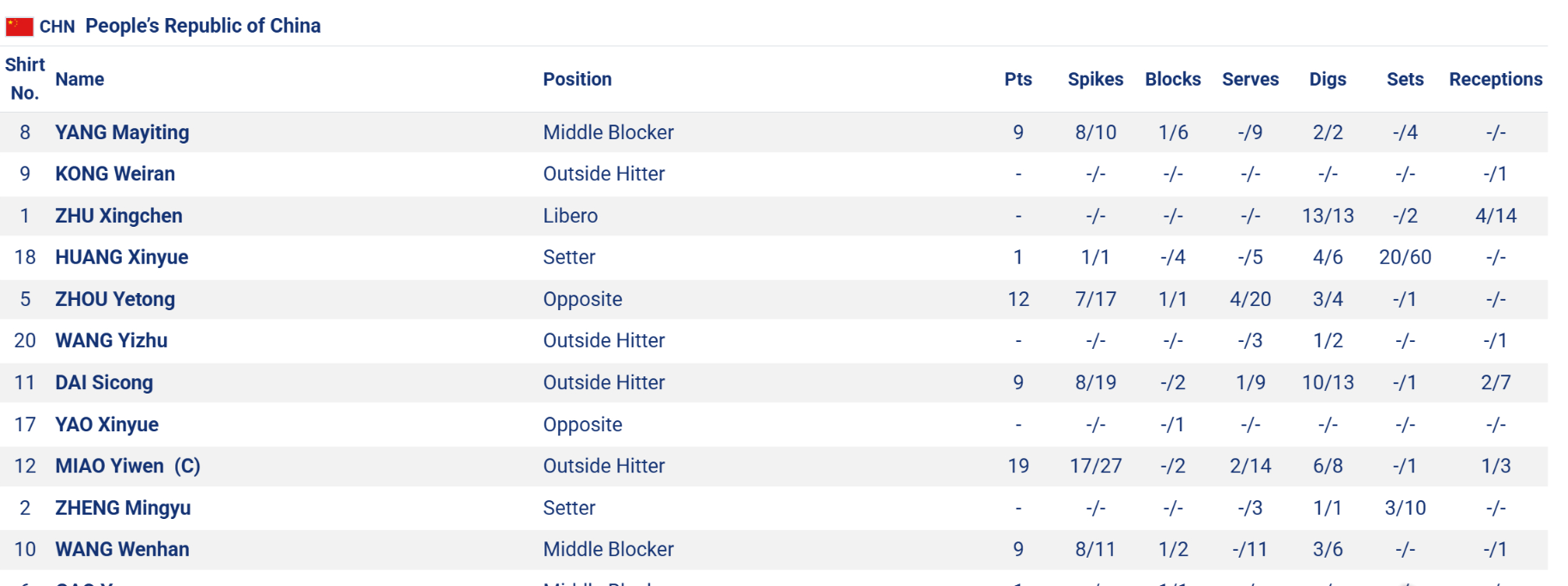 缪伊雯19分 27扣17中 2发 周页彤12分 17扣7中 4发1拦 杨玛依婷9分 10扣8中 1拦 王文涵9分 11扣8中 1拦 戴思聪9分 19扣8中 1发 高雅1分 1拦 黄欣悦1分 1扣1中
