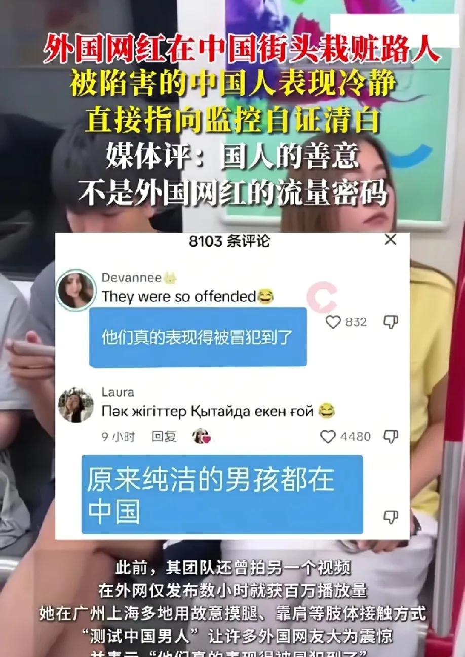 外国女网红在广州、上海等地摸男生的大腿把这些偷拍成视频,发到外网,视频点击量几小时就突破百万,这位女网友还说是为了测试中国男生,还说“原来纯洁的男生都在中国” 为了测试女生,这位女网友直接跑到一家店里,把一位女子的手机偷了后放店员的口袋里,并说店员偷拿了女子的手机,最后女店员要求查看监控自证清白 网友:都伸手摸旁边男的腿了,这不妥妥的性骚扰吗。这会儿还磨叽什么,直接送进去拘留十五天,然后把这些洋垃圾赶出去 偷手机栽赃给售货员是真狗, 这种就应该报警,把这种外国网红关进去,然后驱逐出境。中国人还是太善良