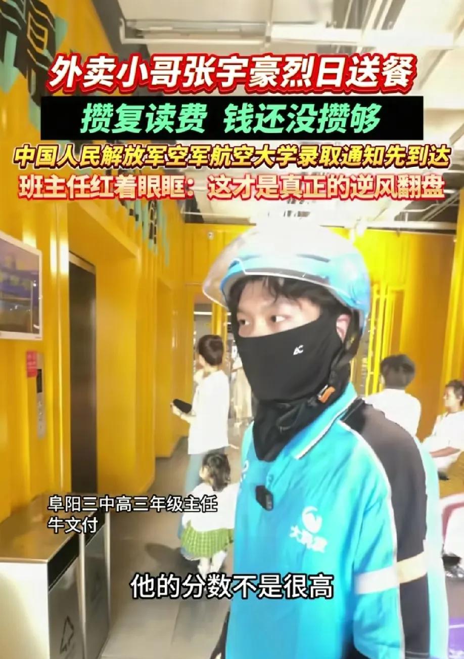 万般皆是命! 谁能想到航空大学录取通知书到达时,张宇豪正顶着大太阳在送外卖! 张宇豪的班主任说:高考成绩出来时张宇豪的分数不是特别高,张宇豪以为没希望了,就马上加入了外卖小哥,想自己赚点钱,准备再复读一年,结果高考成绩超了特控分数线20分,被航空大学录取了! 万般皆是命,半点不由人。这孩子自己都没想到能被军校录取,天助自助者
