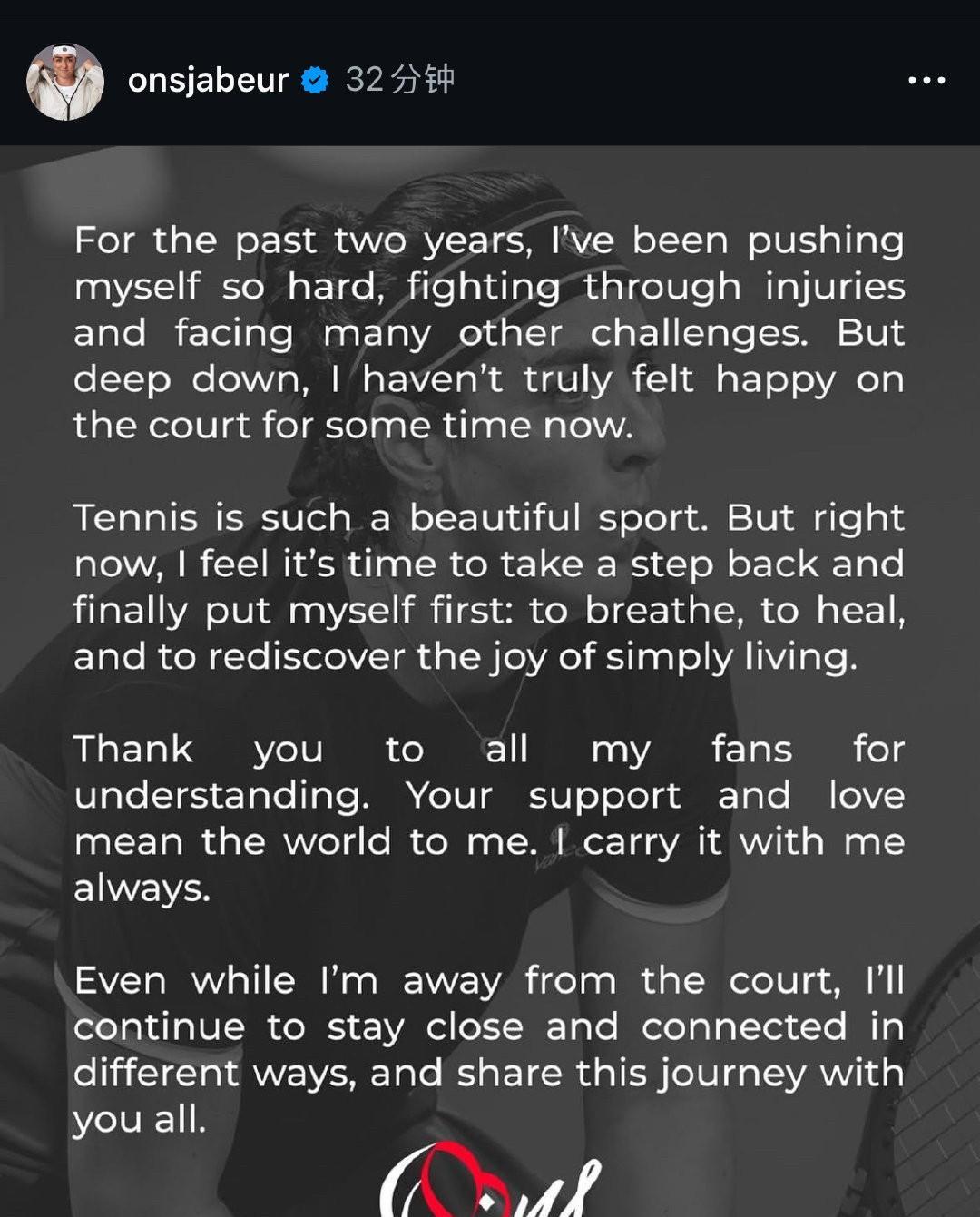 #WTA# 三届大满贯亚军得主贾巴尔宣布暂别网坛。 “过去两年间,我始终推动自己步履不停,尽管伤痛缠身,亦直面重重挑战。然而内心深处,我的那片方寸之地,已有许久未曾真正感受欢愉。 网球,本是如此美好的一项运动。但此刻,我深知是时候暂别赛场,终于该将自己置于首位:去呼吸,去疗愈,去重拾生活本真的喜悦。 感谢所有理解我的球迷。你们的支持与厚爱,于我而言就是整个世界,我将永远携之同行。 即便远离赛场,我亦会以不同方式与你们紧密相连,与大家分享共度这段旅程。” 其实当年两届温网她的机会都很大,好像就是打着打着就浪没了,好可惜。收到伤病影响,最近状态下降很多。期待她休息后能尽快返回赛场。老将不易,加油