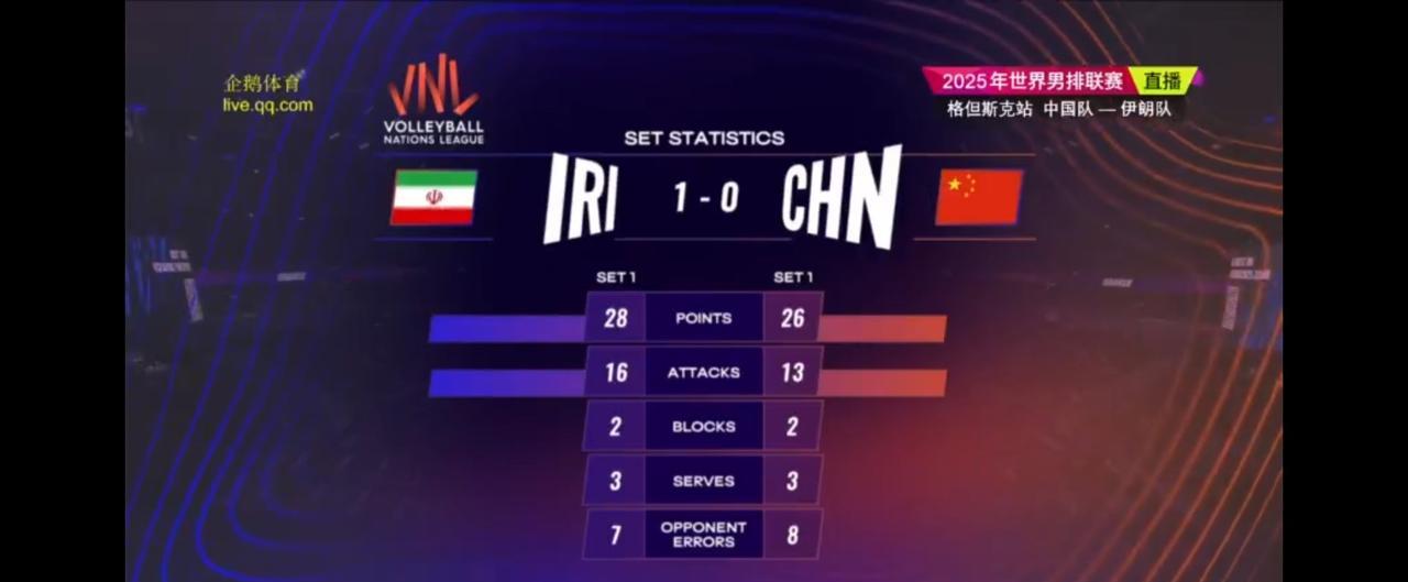 #中国男排# 2025年世界男排联赛波兰格但斯克站 中国男排vs伊朗男排 第一局:26-28 大比分:0-1(26-28) 比赛开始后,两队比分交替上升,局中阶段中国队依靠对方失误和拦网拉开两分优势,可是局末一传出现波动,让对方反超比分,在对方拿到局点施工,王滨发球直得追平,可惜最后副攻失误输了第一局#世界男排联赛#