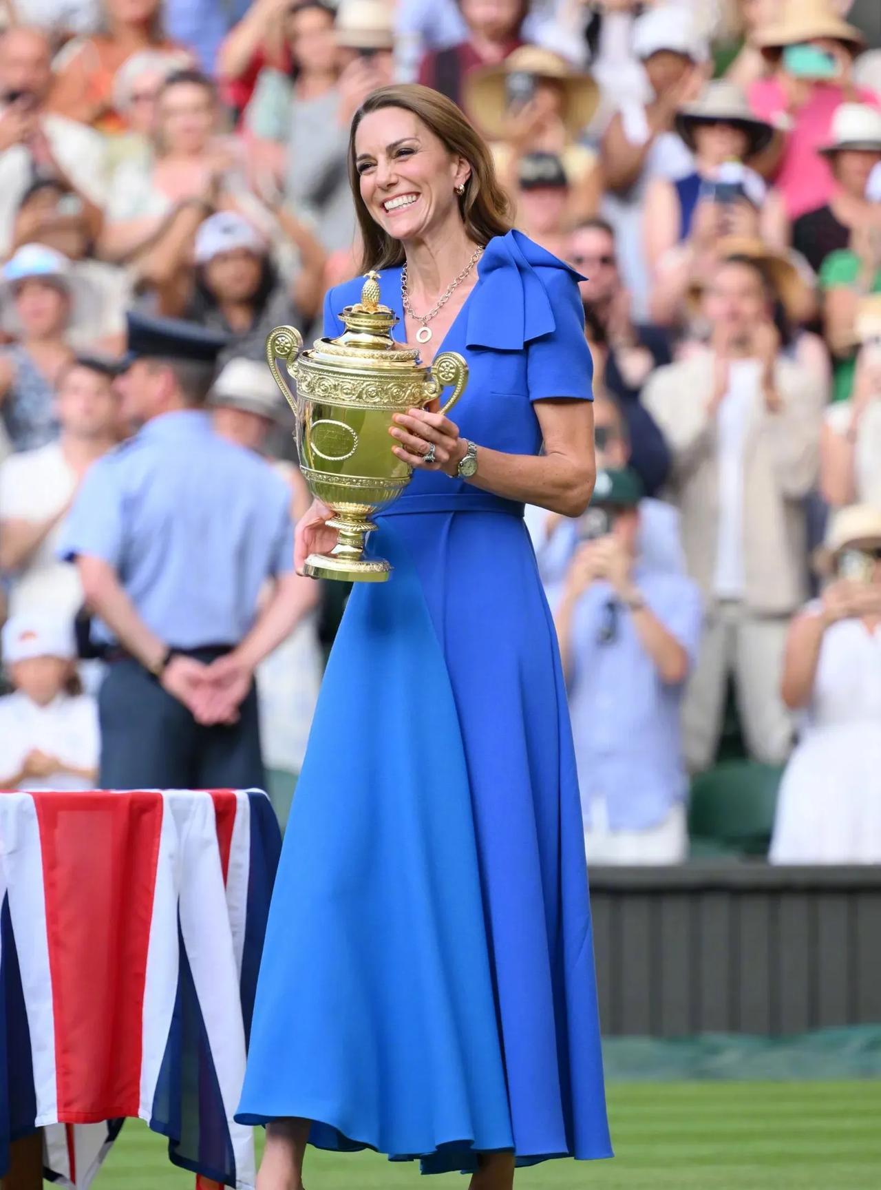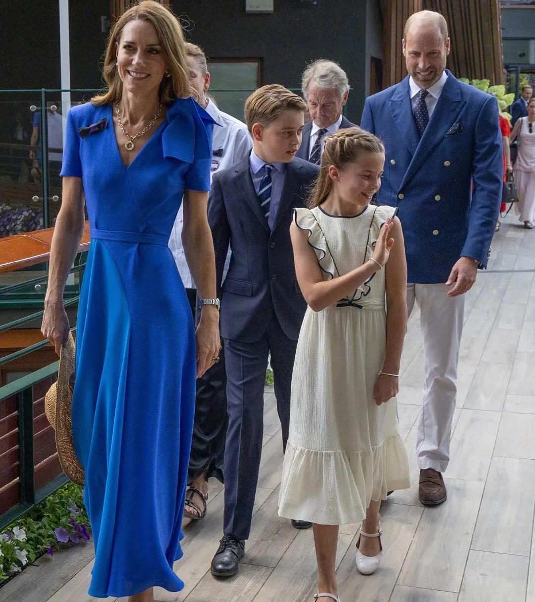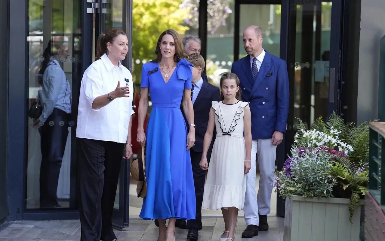 2025年温布尔登网球公开赛决赛,凯特王妃与威廉王子携12岁的乔治王子和10岁的夏洛特公主出席,全家身着皇家蓝色系亮相。威廉身穿dunhill蓝色西装搭配波点领带,乔治同样蓝色西装佩戴领带。凯特身穿ROKSANDA定制蓝色连衣裙,搭配卡地亚耳环与腕表、拉夫劳伦高跟鞋、Daniella Draper项链、LKBennett草帽、Ralph Lauren太阳镜及Anya Hindmarch手提包。夏洛特则身穿Sarah Burton定制的白色连衣裙,搭配海军蓝荷叶边,脚穿Pappouelli芭蕾平底鞋,佩戴Ray-Ban儿童墨镜、pandora手链及迪士尼水晶诞生石。兄妹均为阿尔卡拉斯粉丝,但最终辛纳夺冠,赛后两人仍获得冠军签名。