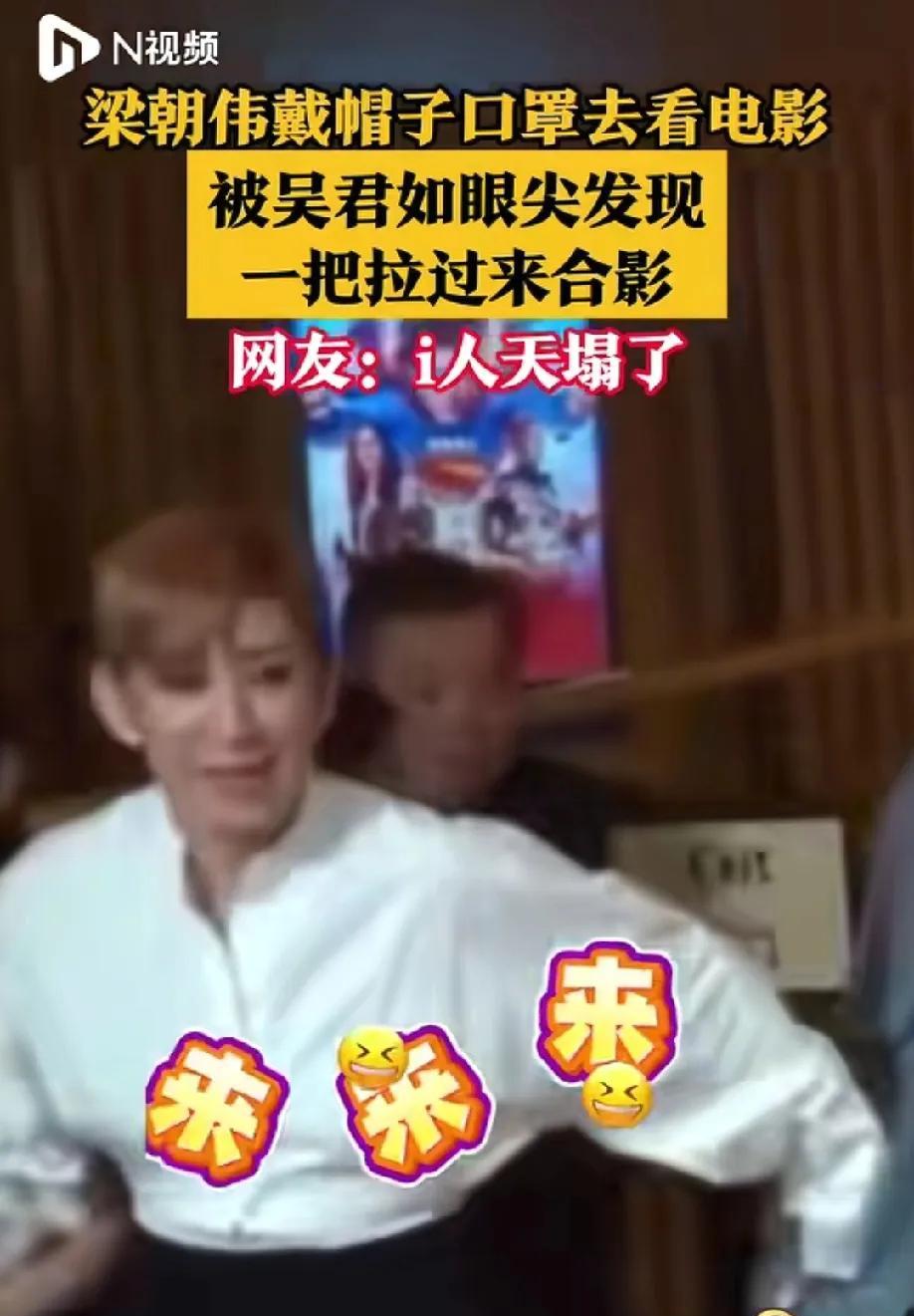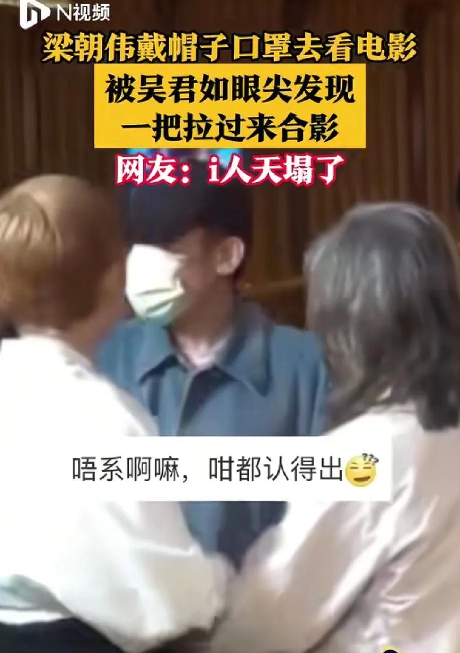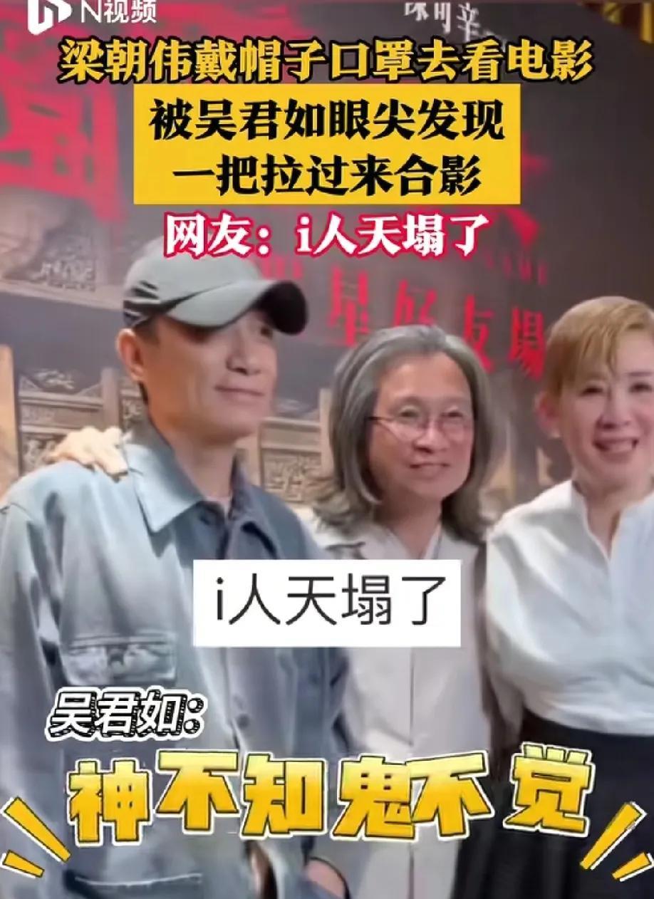 我敢说现在最后悔的就是梁朝伟! 梁朝伟带着口罩和帽子,穿着朴素的衣服,现身《酱园弄》电影现场,支持好友陈可辛,本想偷偷的从后面溜进去看电影,谁知道被眼尖的吴君如发现,便一把把他揪过来,摘掉他的口罩跟帽子要求一起合照。 网友: 梁朝伟是不是欠了吴君如的钱啊,就是那种你就算化成灰了,我都认出来的感觉 梁朝伟晚上回去估计做梦都在想:我就想悄悄的看个电影,这眼也太尖了,我 包这么严都能认出来