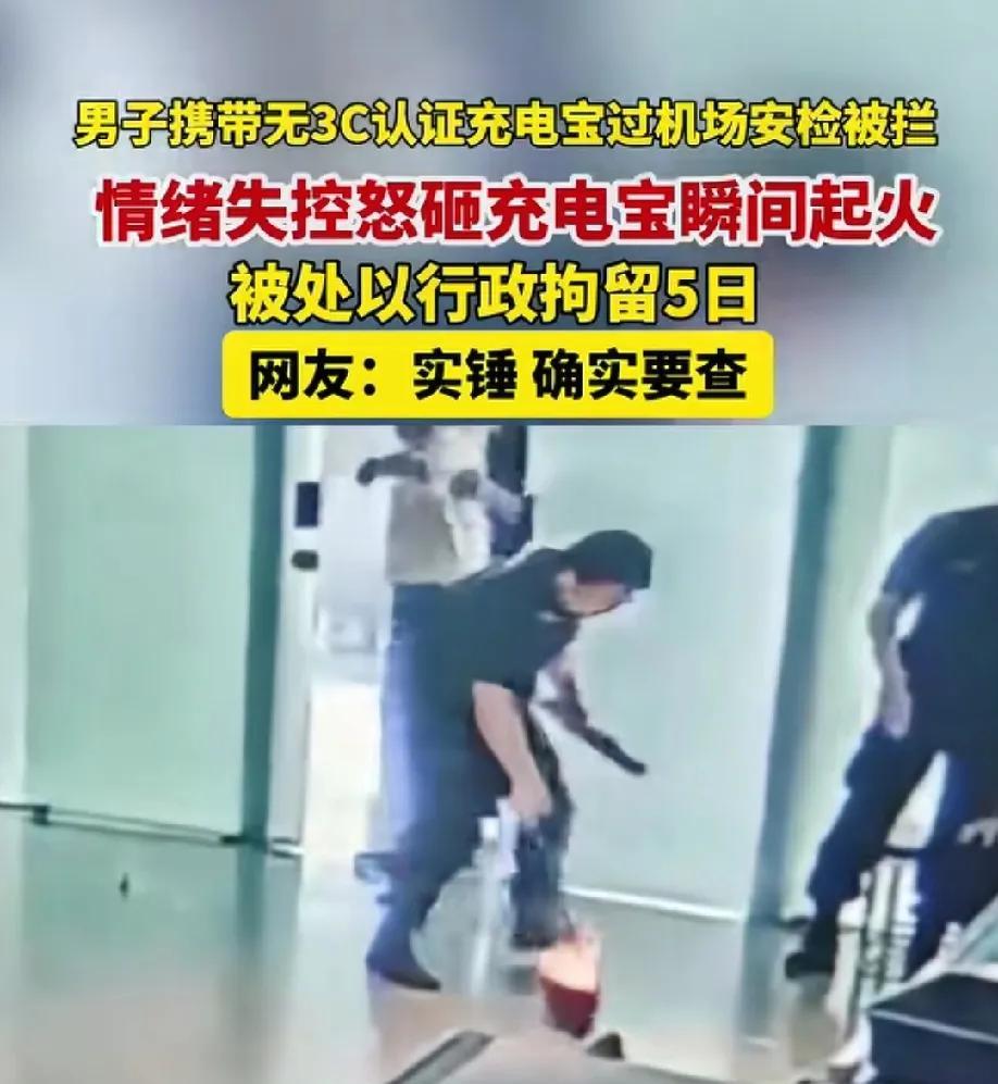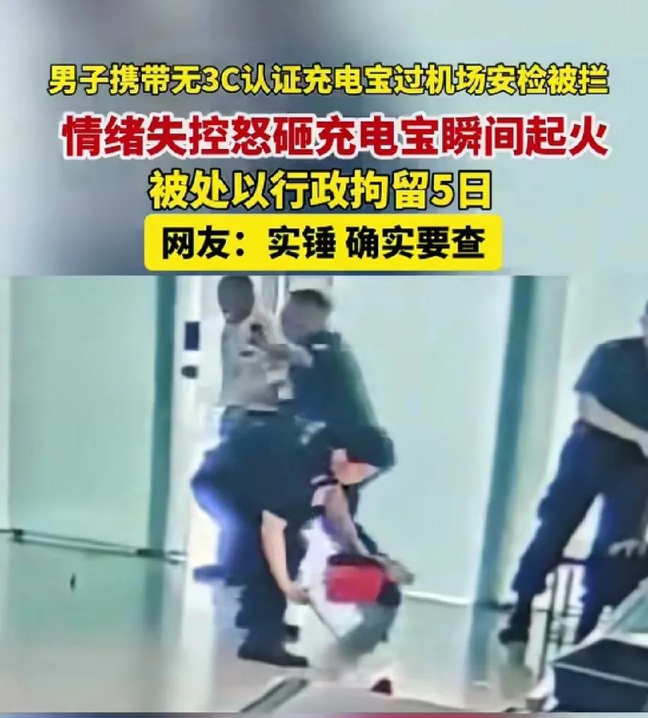 小伙子用行动证明,充电宝真不能带上飞机! 湖北武汉机场一名男子携带无3C认证的充电宝过安检被拦,男子被拦下后情绪失控,直接拿出充电宝摔在地上,充电宝瞬间起火,机场的工作人员赶紧把充电宝夹起,然后用水浇灭。男子也被拘留五天! 网友:说明充电宝质量真不行,还真没有查错,这个是实打实的宣传,不是纸上谈兵。 不用扔掉,6月28日公布这个规定当天就赶上了,我的充电宝没有3C , 机场安检人员给了可以寄回的选项,我就立即填单子寄回家了,全程5分钟解决,机场处理挺好的,真的可以不用这么冲动。